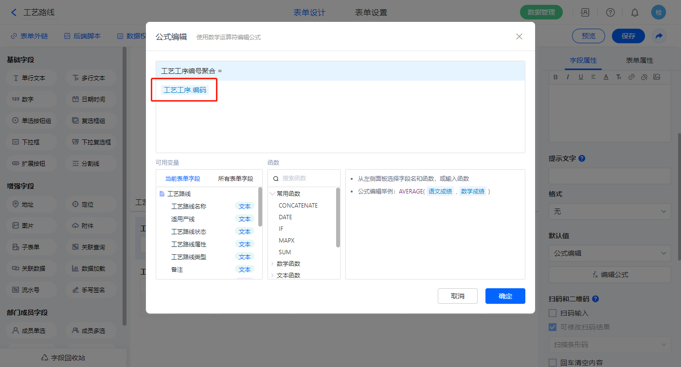 1)【工艺工序编号聚合】字段,设置默认值为公式编辑,如图设置公式;