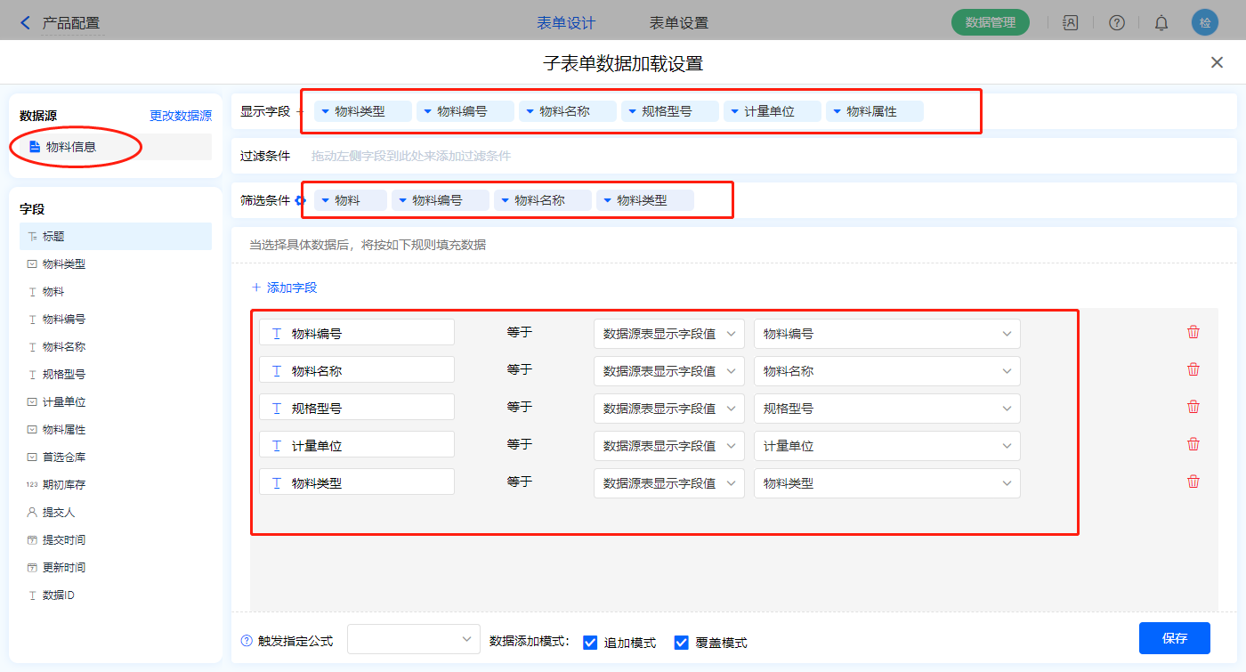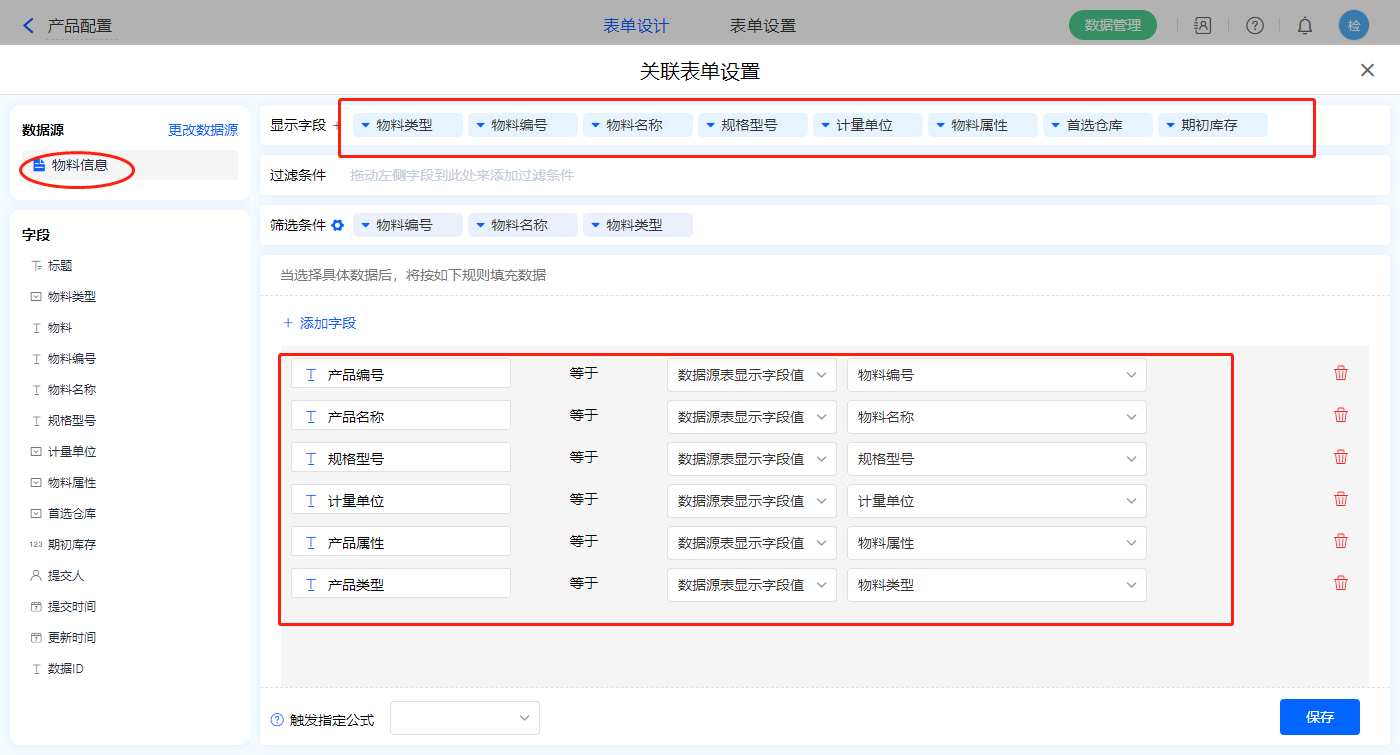 1)【选择产品】数据加载字段,数据源为【物料信息】,添加显示字段设置赋值字段及筛选条件,点击保存;