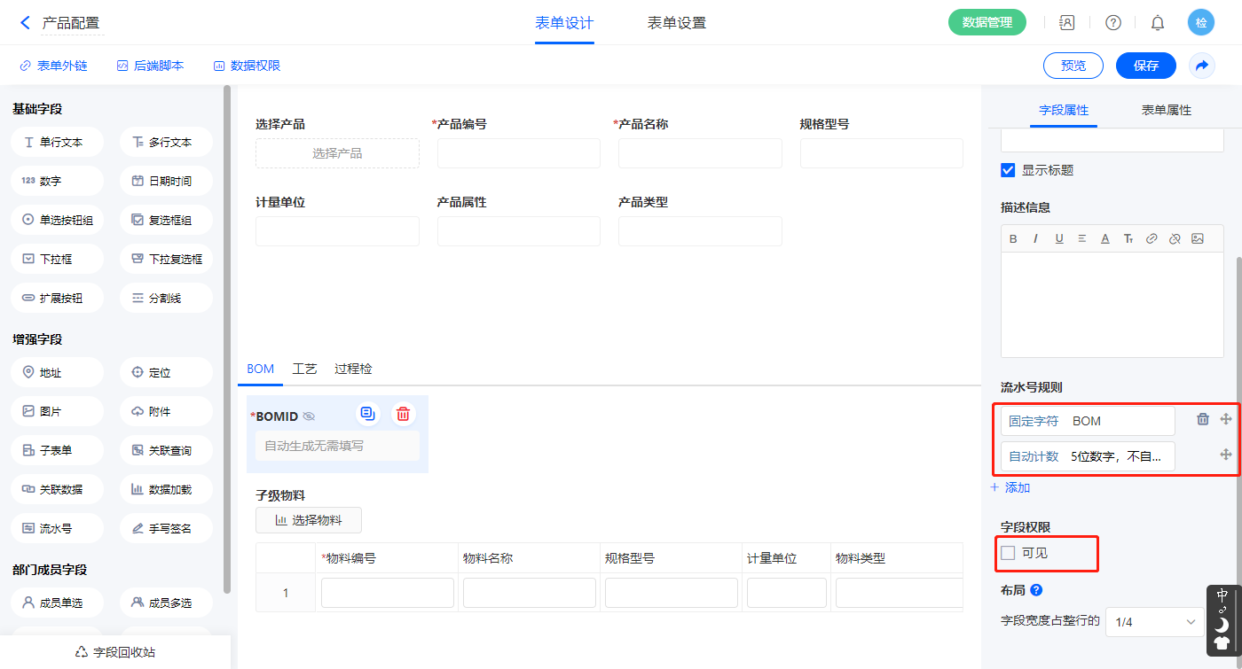 2)【BOMID】字段,配置流水号规则并设置为不可见;