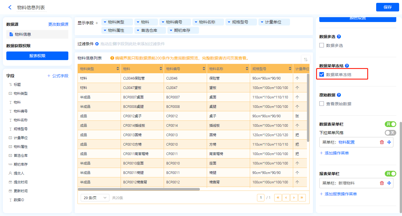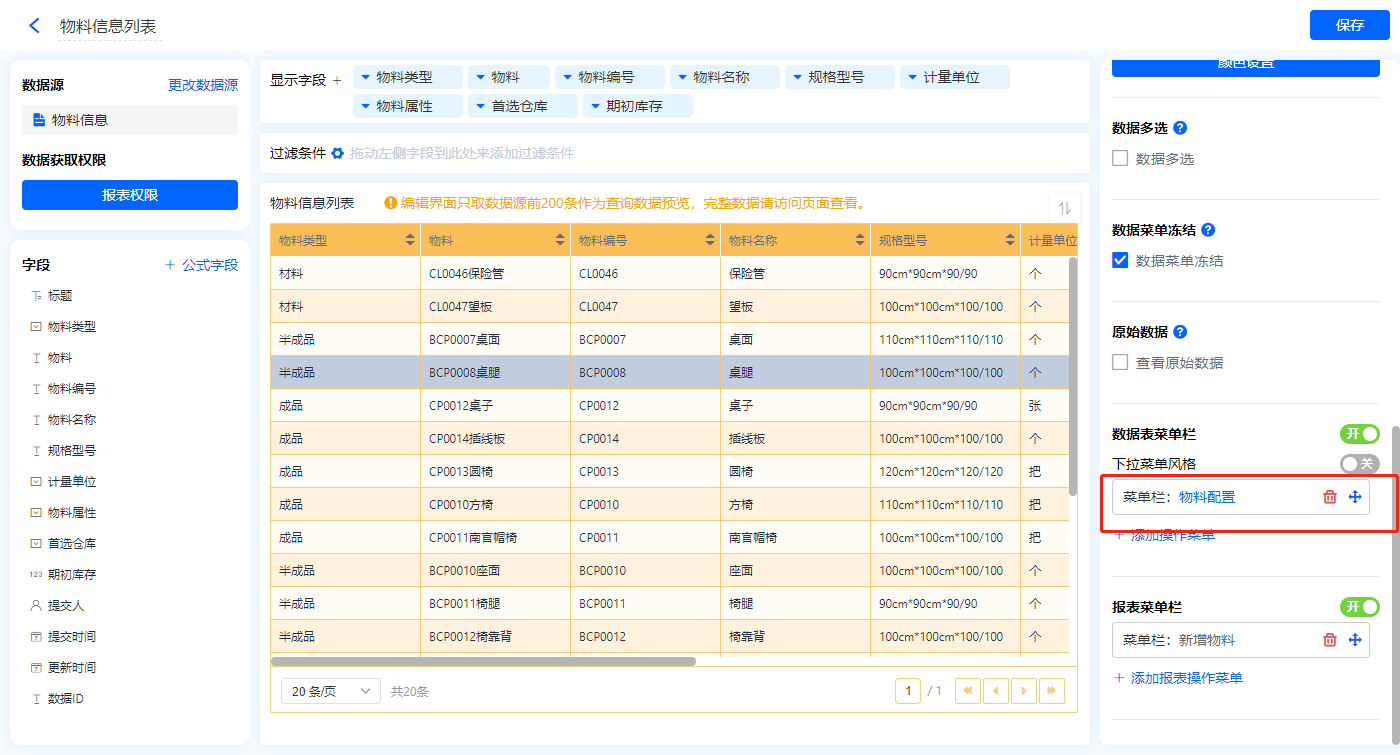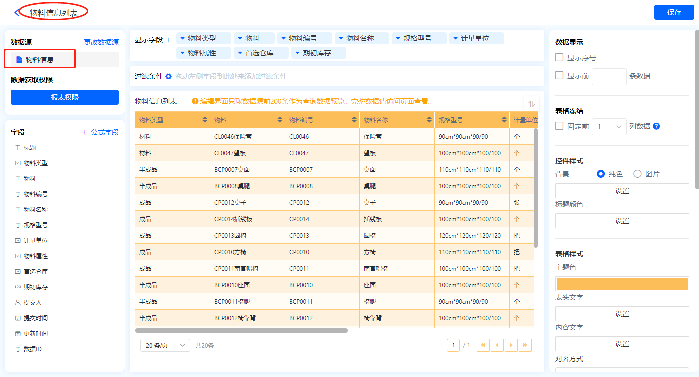 1)新增【物料信息表】报表,用基础报表【数据表】展示数据源为表单【物料信息】的数据;