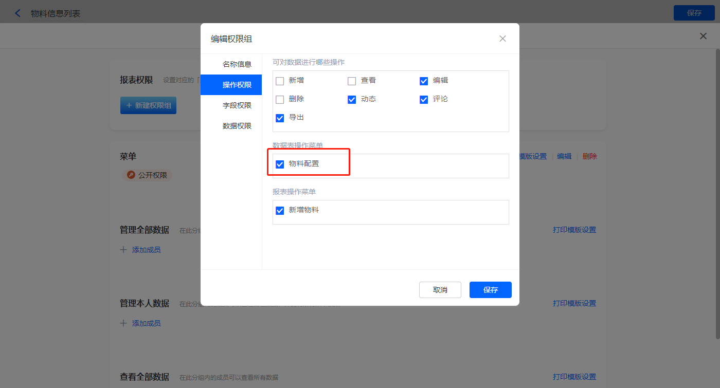 4)设置报表的权限,填入权限组名称,选择可操作的数据表菜单,点击【保存】;