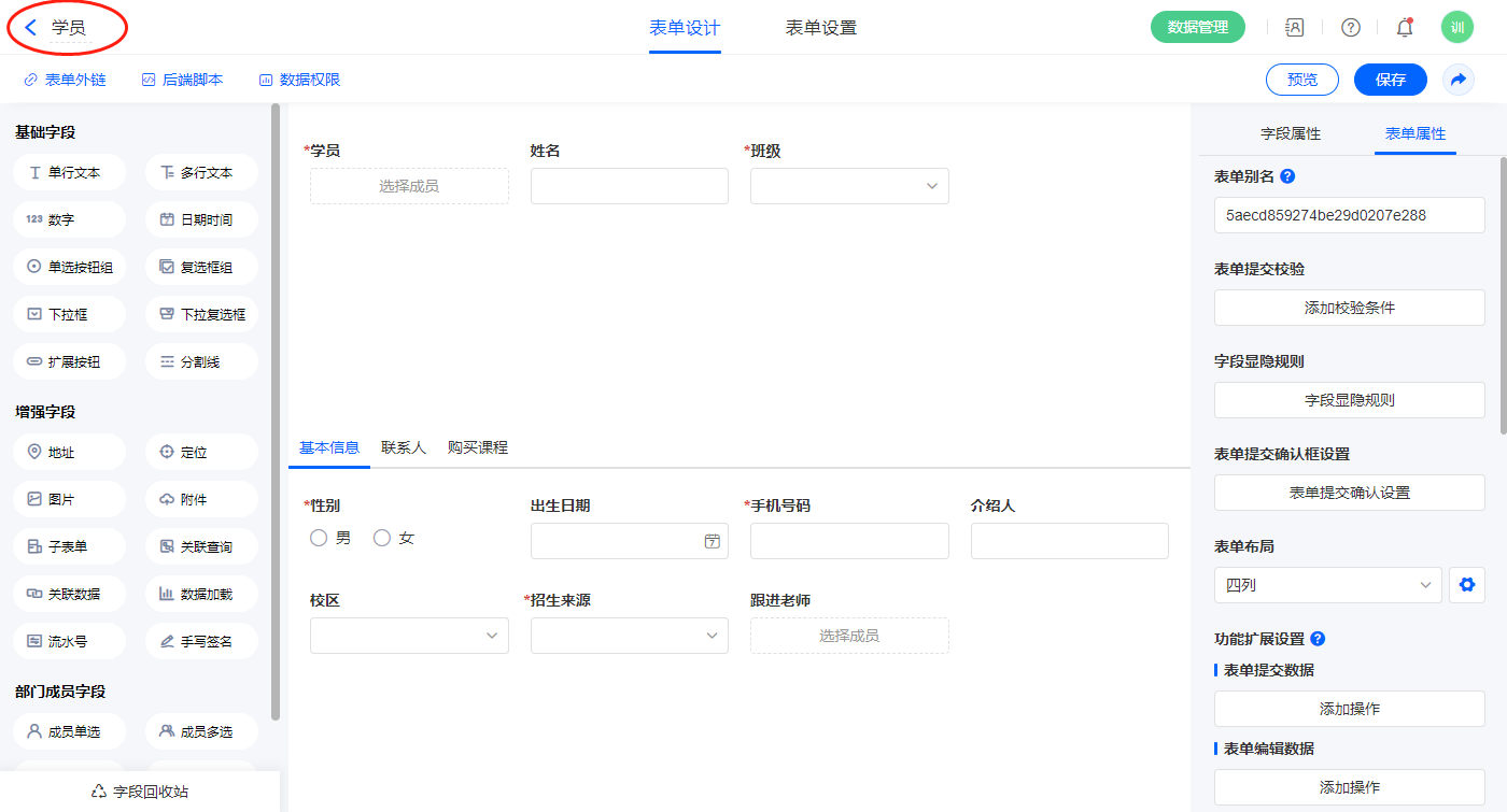 1)新增【学员信息】报表,用基础报表【数据表】展示数据源为表单【学员】的数据;