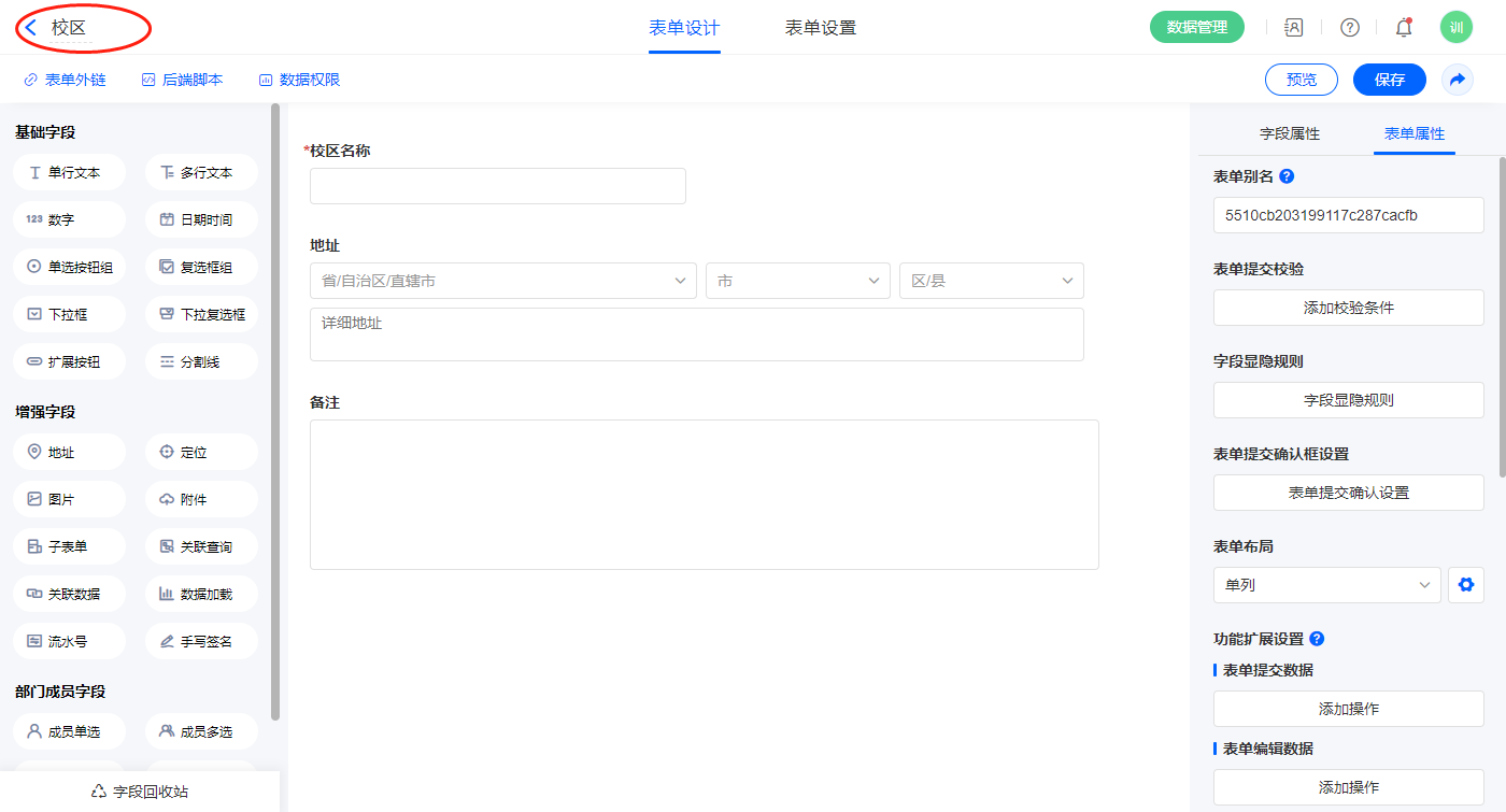 1)【姓名】字段,默认值选择公式编辑,如图设置公式,并设置操作权限为不可见;