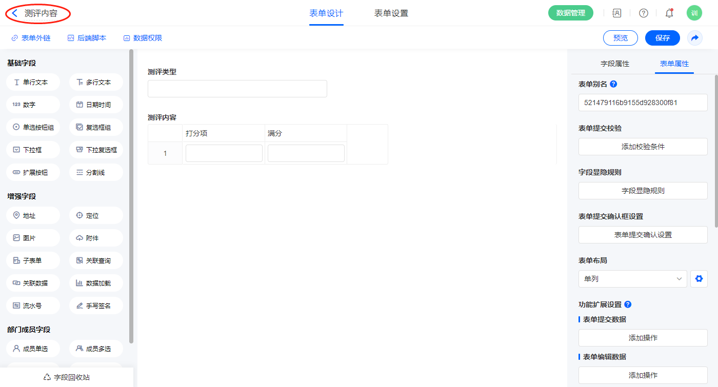 【测评详情】子表单字段,设置默认值为数据联动,设置联动条件及联动字段;