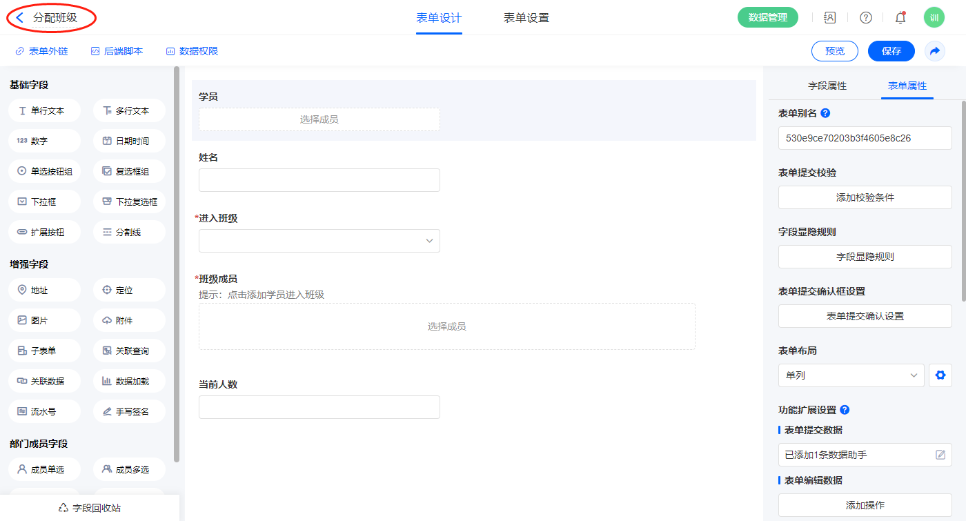 2)表单提交设置1条数据助手,名称为修改班级人数;