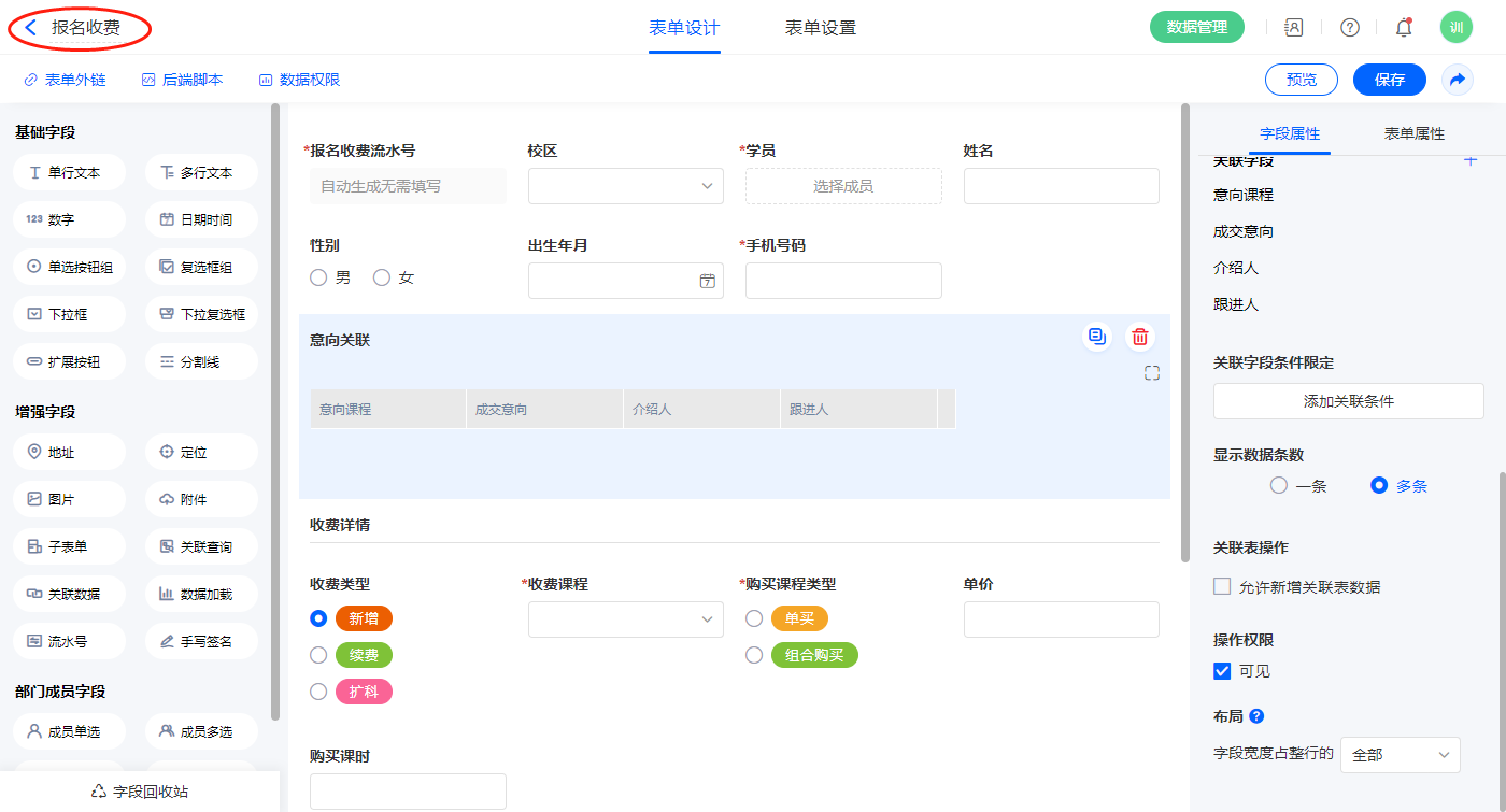 【续课】的菜单栏,操作模式设置为弹出表单【报名收费】;