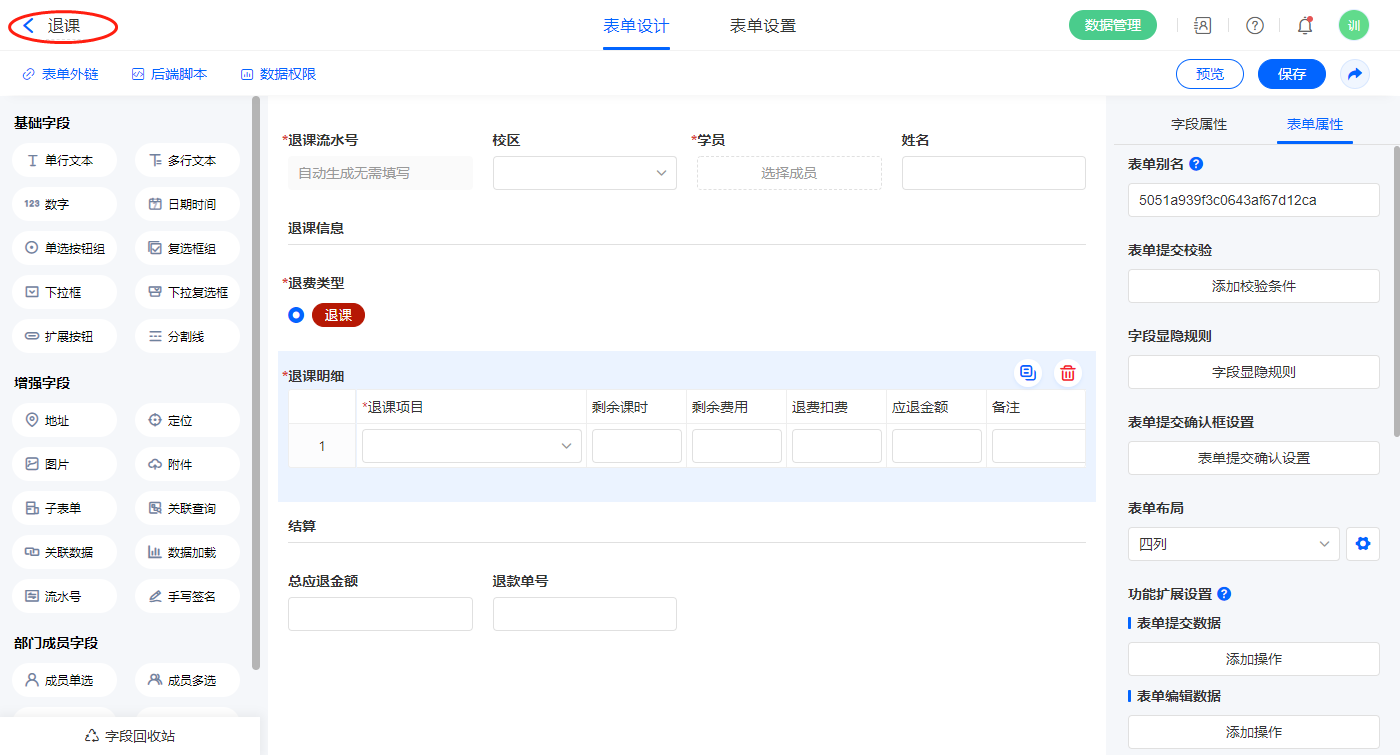 【退费类型】字段设置默认值为“退课”,并设置操作权限为不可见;