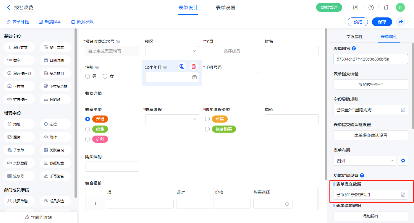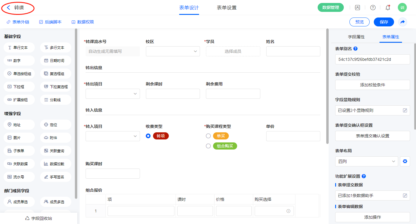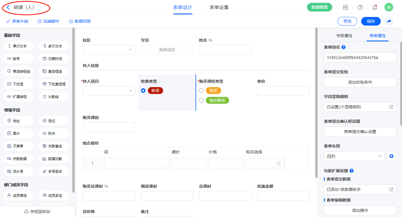 3)表单属性设置两条显隐规则,当【购买课程类型】字段等于单买,显示【购买课时】字段;当【购买课程类型】字段等于组合,显示【组合报价】字段;