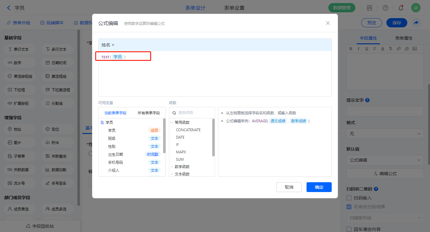1)【当前人数】字段,默认值选择公式编辑,如图设置公式;