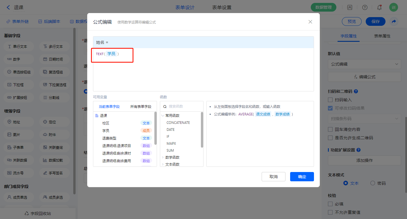 【退课明细.应退金额】字段,默认值选择公式编辑,如图设置公式;