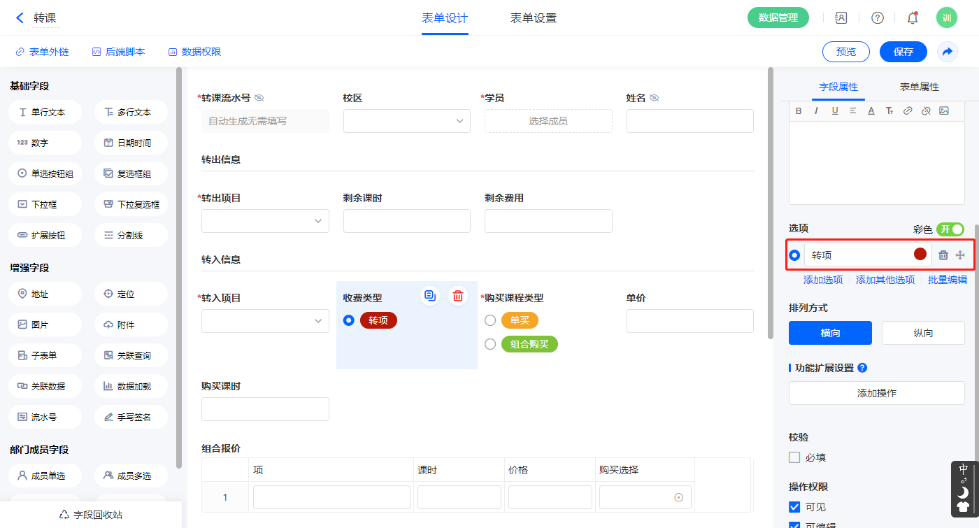 【转课流水号】、【购买总课时】、【结算金额】、【收/退款单】字段设置操作权限为不可见;