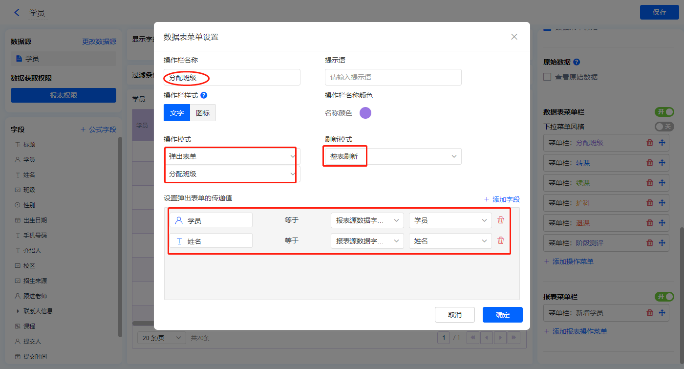 【分配班级】的菜单栏,操作模式设置为弹出表单【分配班级】;