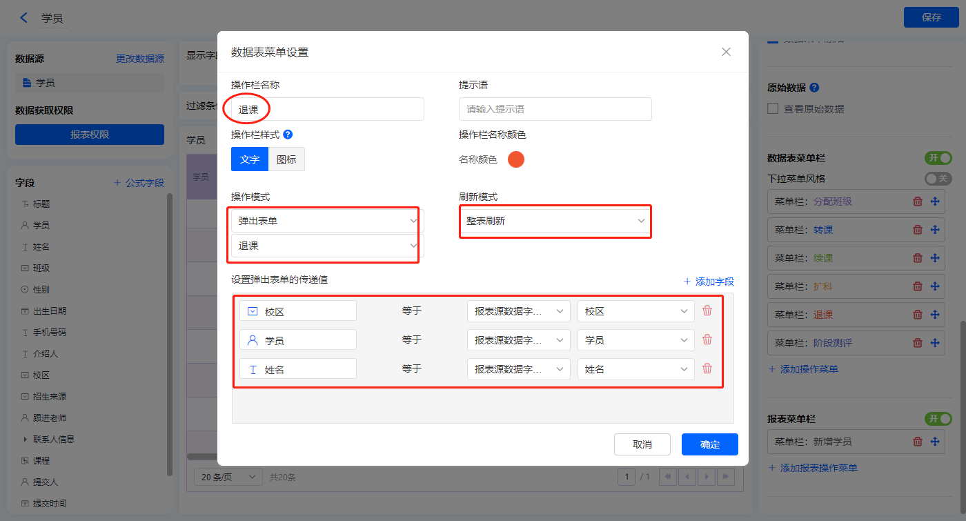 【退课】的菜单栏,操作模式设置为弹出表单【退课】;