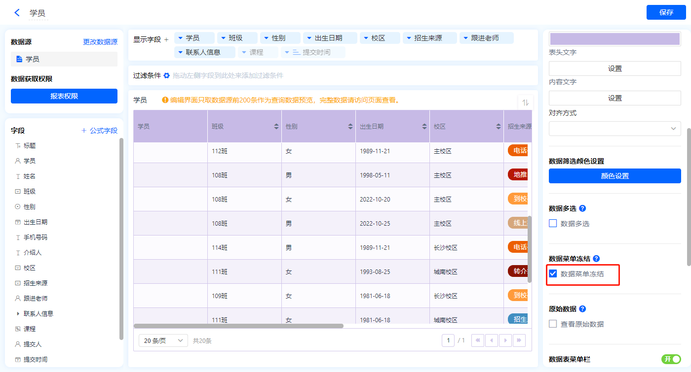 3)数据菜单冻结属性打钩,固定数据表菜单栏位置;