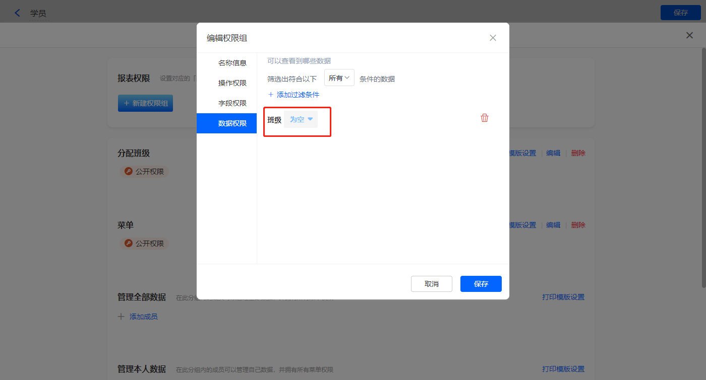 4)设置报表的权限,填入权限组名称分配班级,选择可操作的数据表菜单;