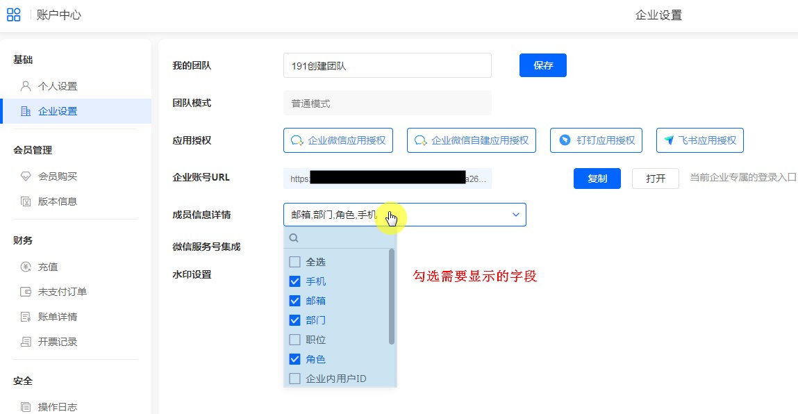 展示团队的基本信息,可以绑定钉钉或企业微信。