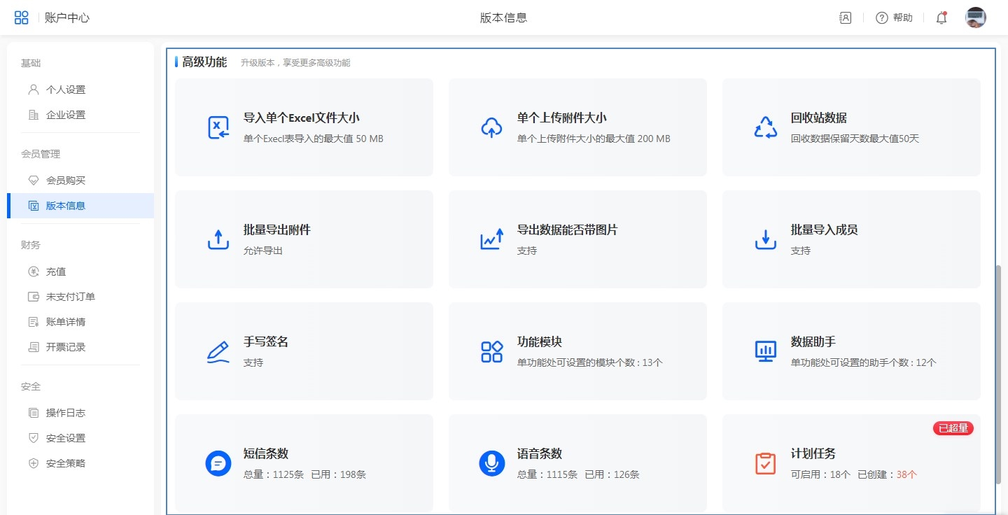 展示了当前系统的一些付费功能,有需要可以升级:鼠标放置在功能上出现升级按钮,点击升级即可进入升级页面,购买会员和升级参考上面会员购买章节。