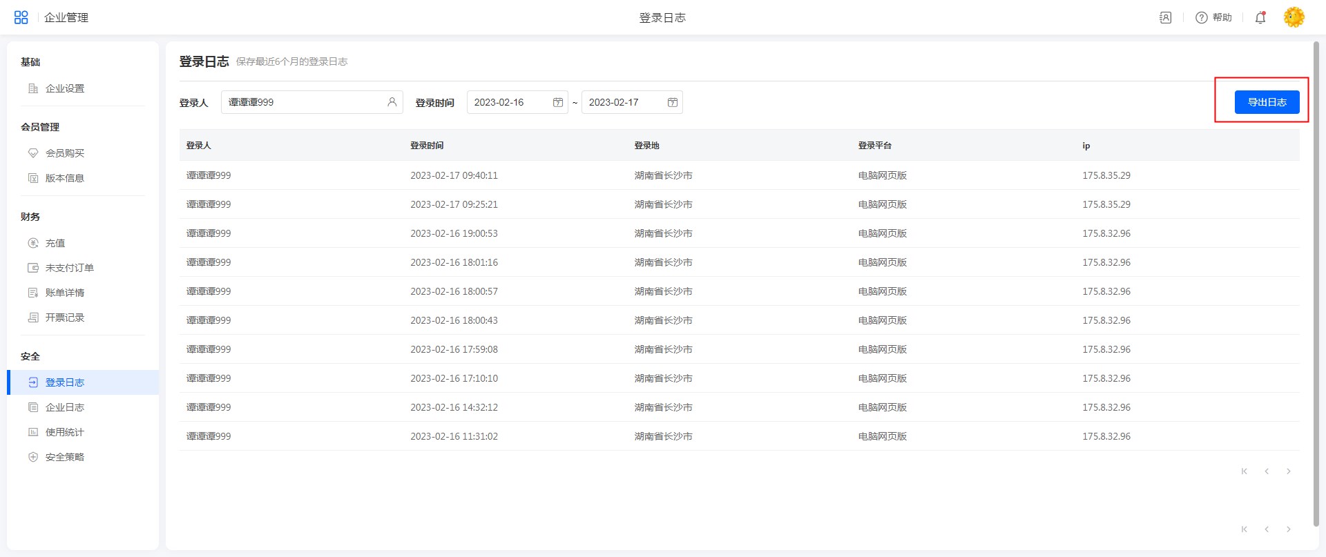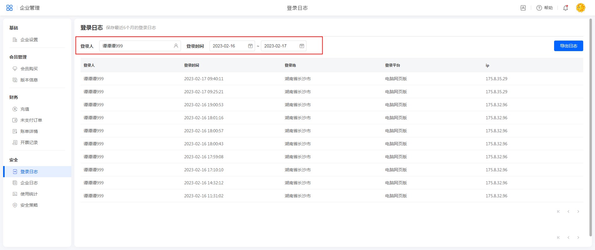 • 系统管理员可以查看到团队所有成员的登录日志,成员只能查看到自己的登录日志。