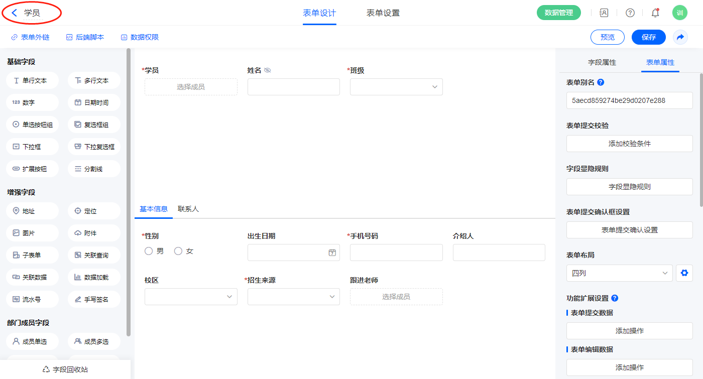 1)【学员】字段,设置默认值为数据联动,设置联动条件及联动字段;