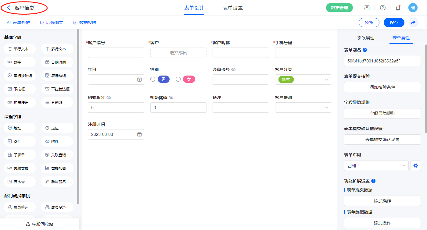1)新增【会员资料】报表,用基础报表【数据表】展示数据源为表单【客户信息】的数据;