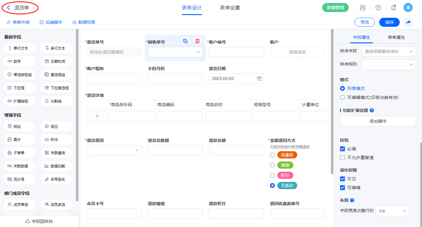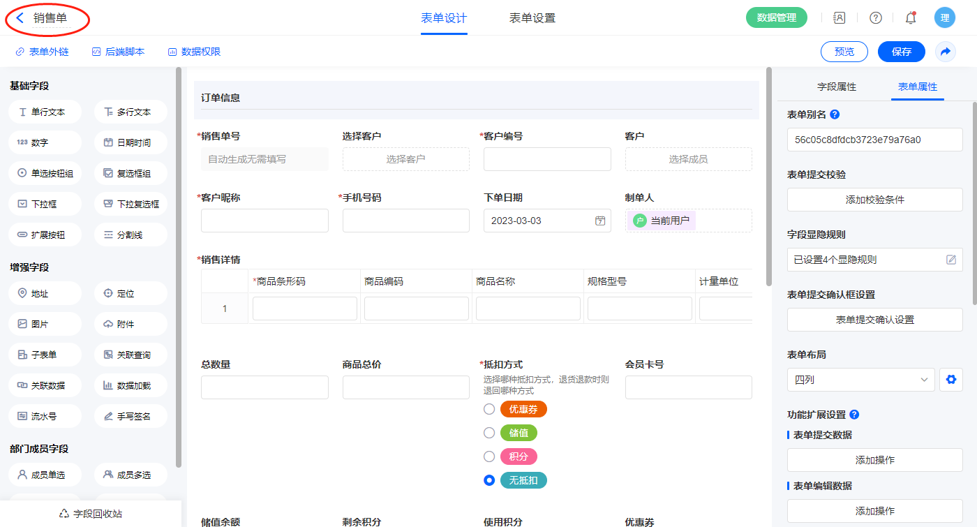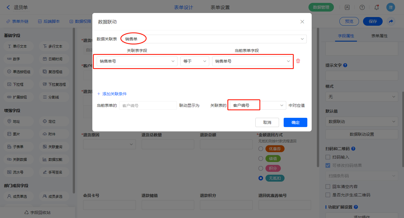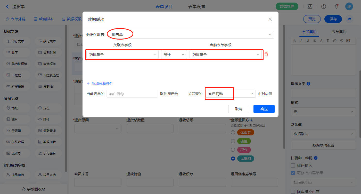 1)【销售单号】字段,选择设置为关联其他表单数据,关联销售单的【销售单号】字段;