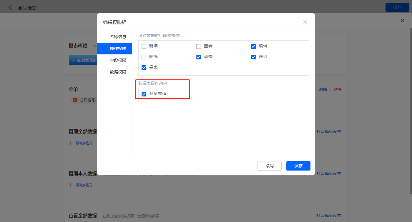 【会员充值】的菜单栏,操作模式设置为弹出表单【会员充值】;