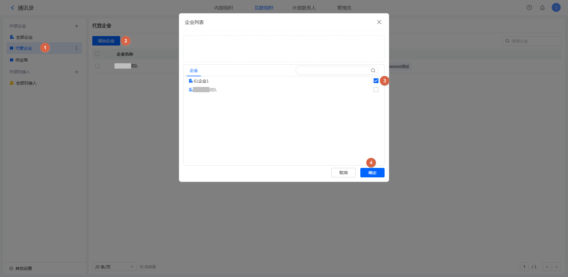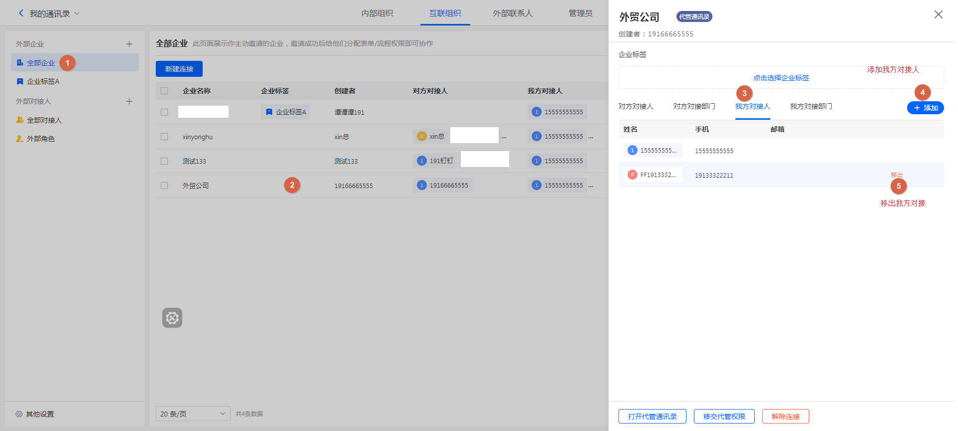 连接的企业具有通讯录代管权限的,我们称之为「代管企业」。对于代管企业,我们可以在不登录对方账号的前提下为其添加对接人。