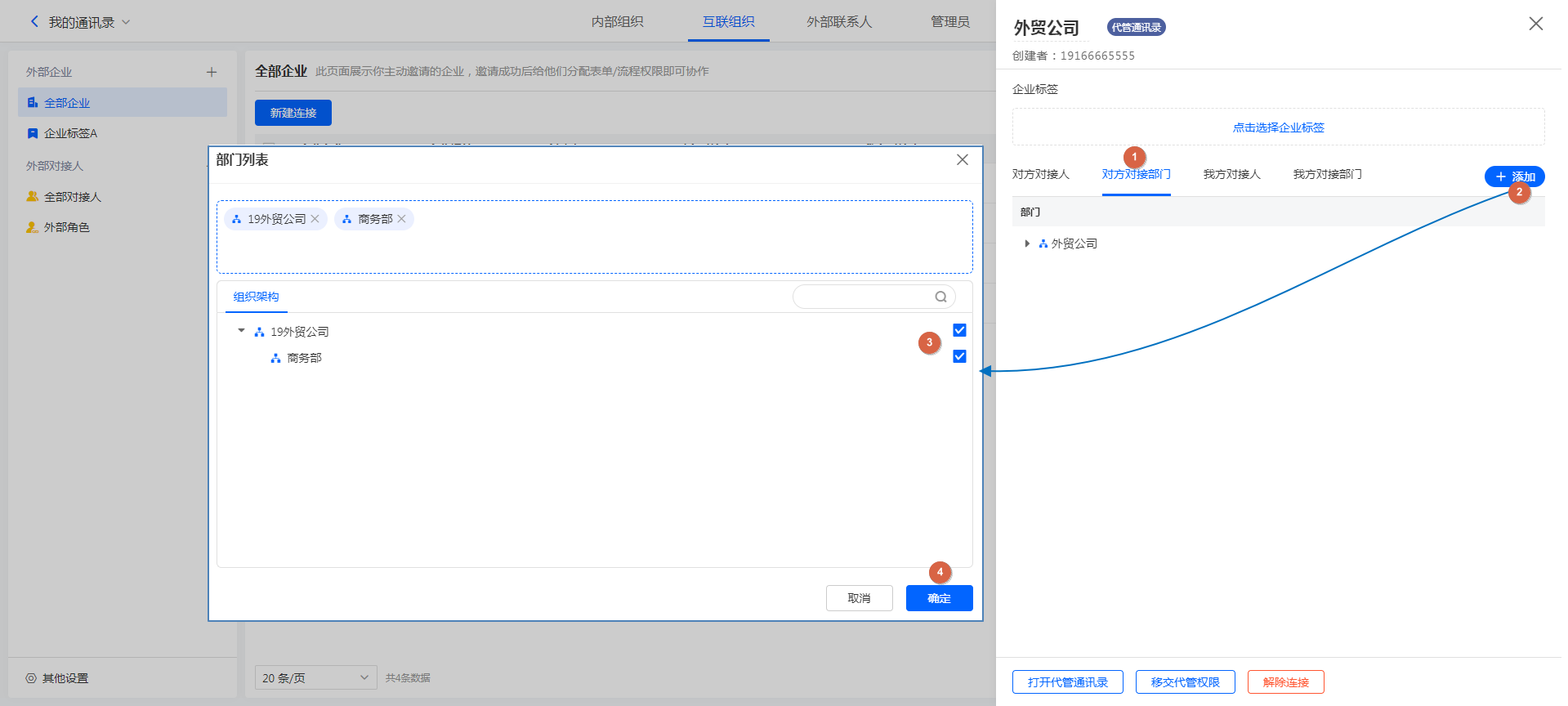 • 添加对方对接部门