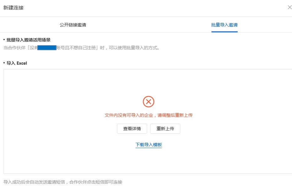 当我们需要连接的企业未注册过,那么我们可以通过导入的方式快速建立企业连接。在导入的过程中,可能出现部分或者全部企业导入失败,详情参考下文: