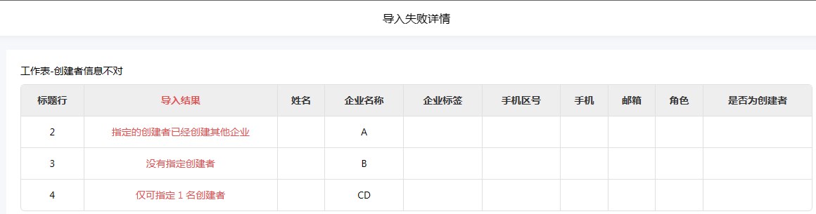 当创建者资料不符合要求时,会出现如下图所示的一种或多种报错,任意一种报错都会导致该企业无法导入成功: