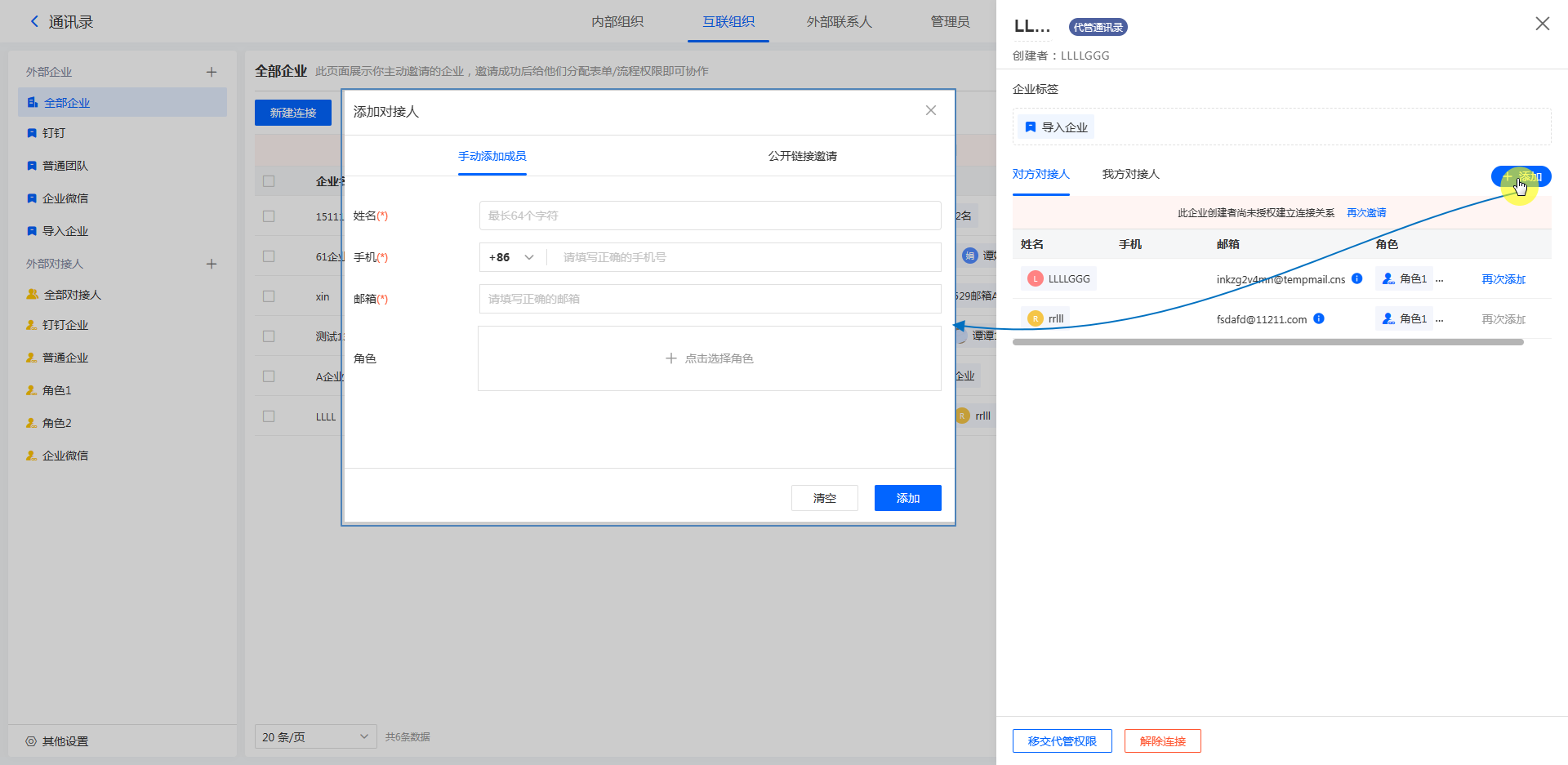 如果企业导入成功后,部分成员未导入成功,那么未成功导入的成员需要在导入成功的企业详情里一一添加。如下图所示: