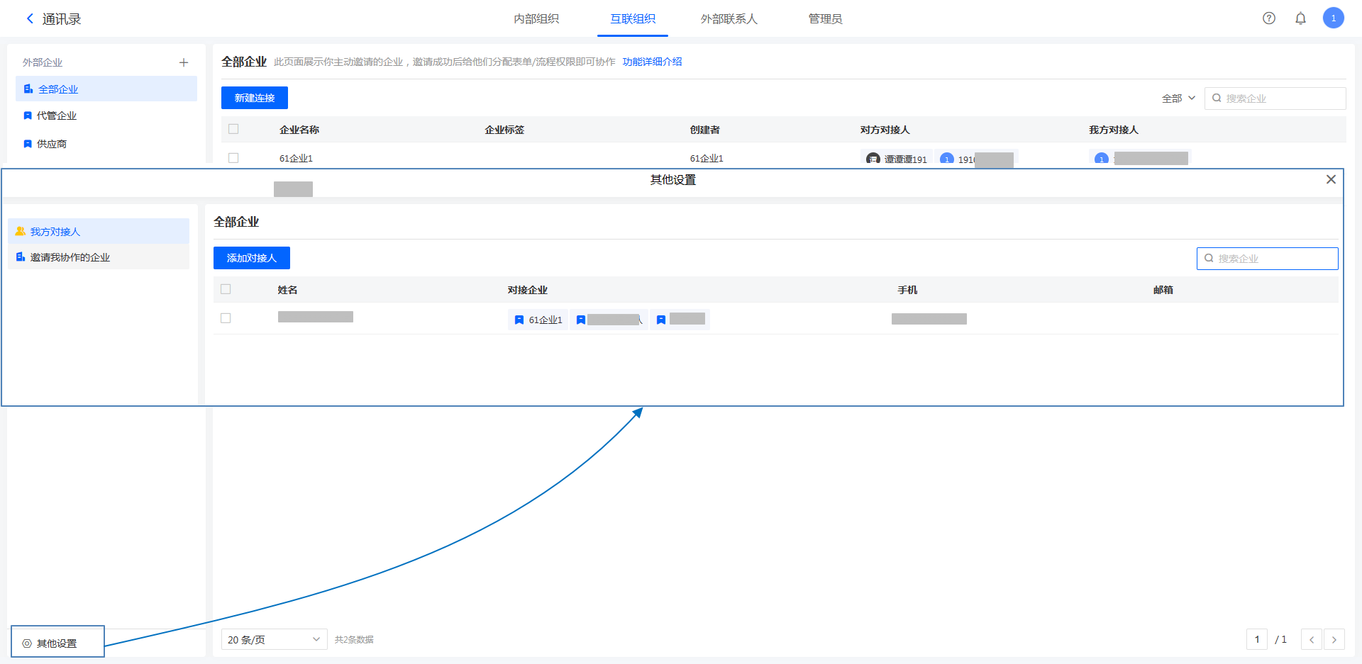 注意:只有内部成员可以设置为对接人,外部联系人不可设置为对接人;即外部联系人不参与企业互联的任何业务。