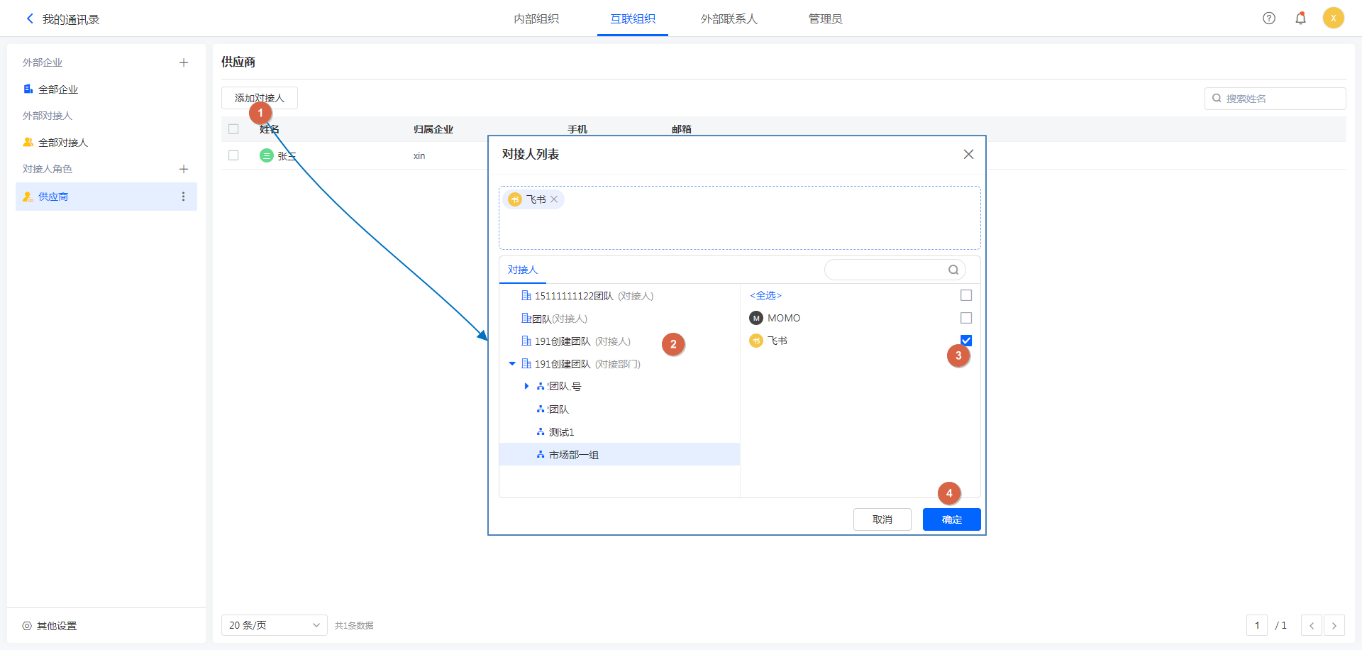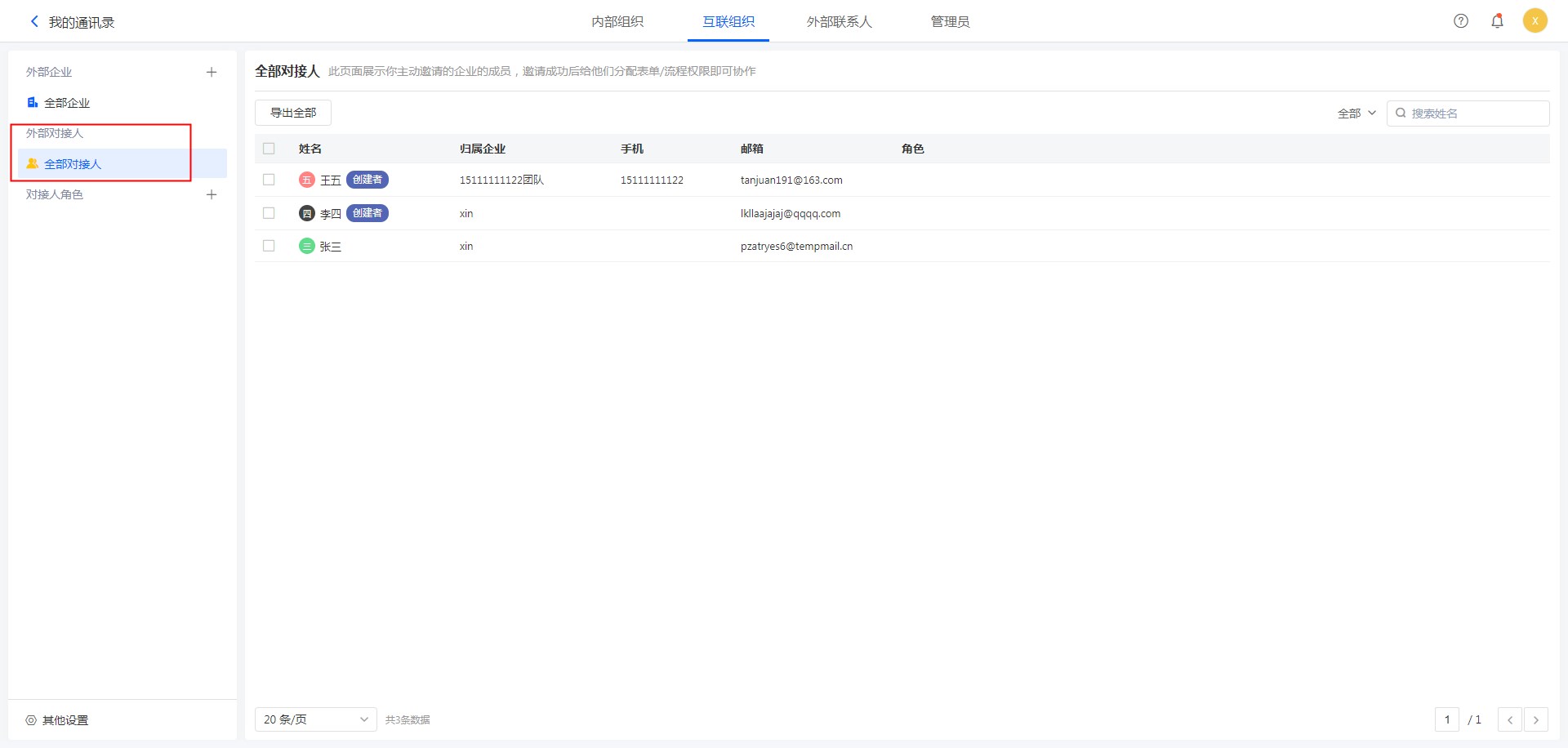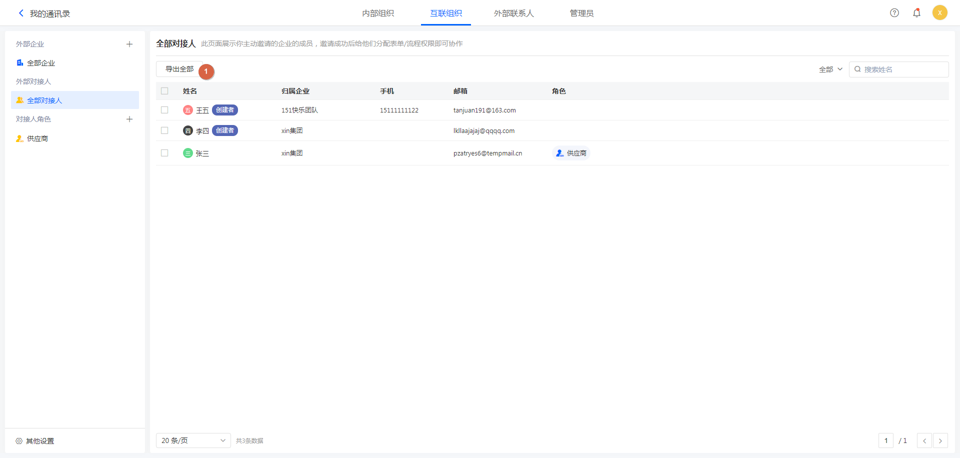 全部对接人列表中,显示了互联组织中的对方对接人。