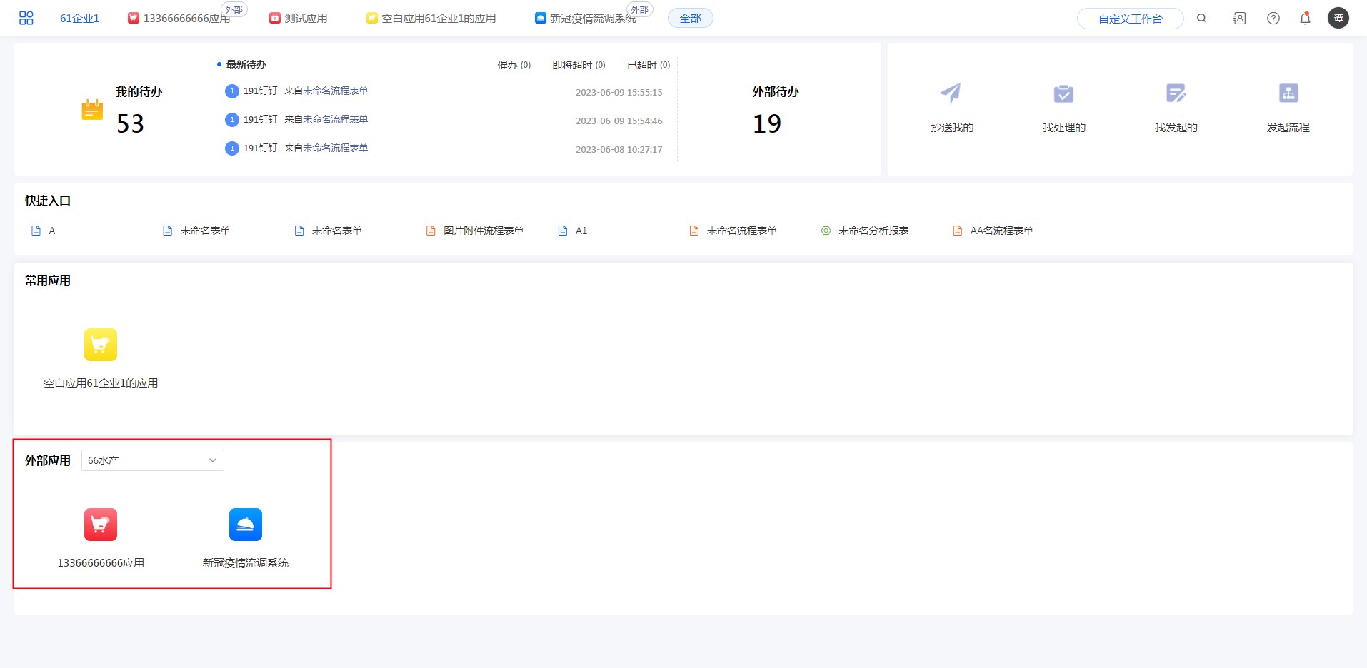 当前团队作为其他团队的互联企业,为了方面快捷的访问快捷应用,对接人可以设计我的工作台,添加外部应用板块,效果如下:
