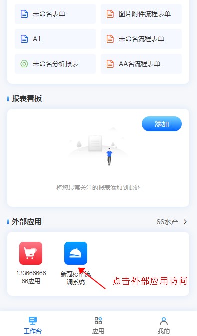 工作台->自定义工作台->设置我的工作台->左侧拖动外部应用到右侧面板->保存。