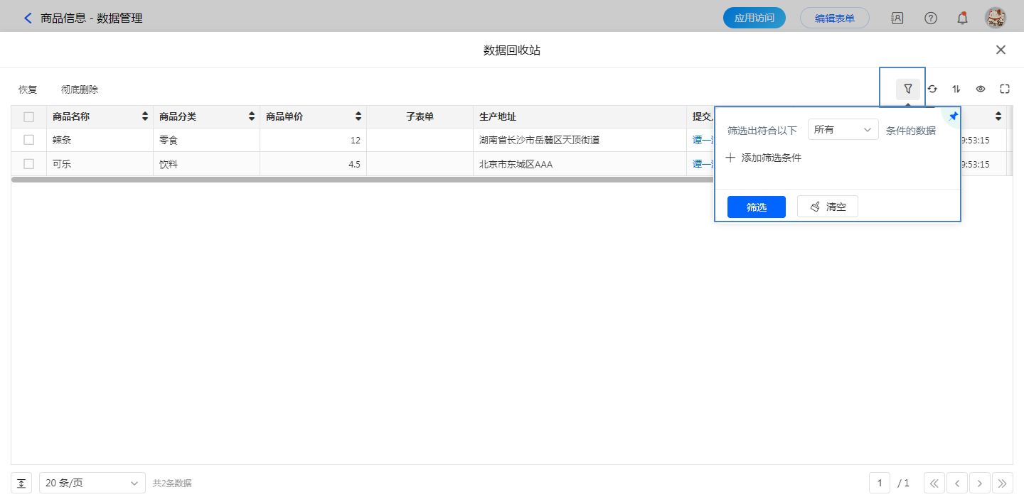 可以设置筛选条件,在回收站中快速查找数据。