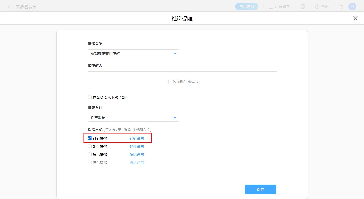 【应用管理】-【报表设计】-【定时提醒】 -【提醒方式】-【钉钉提醒,钉钉设置】
