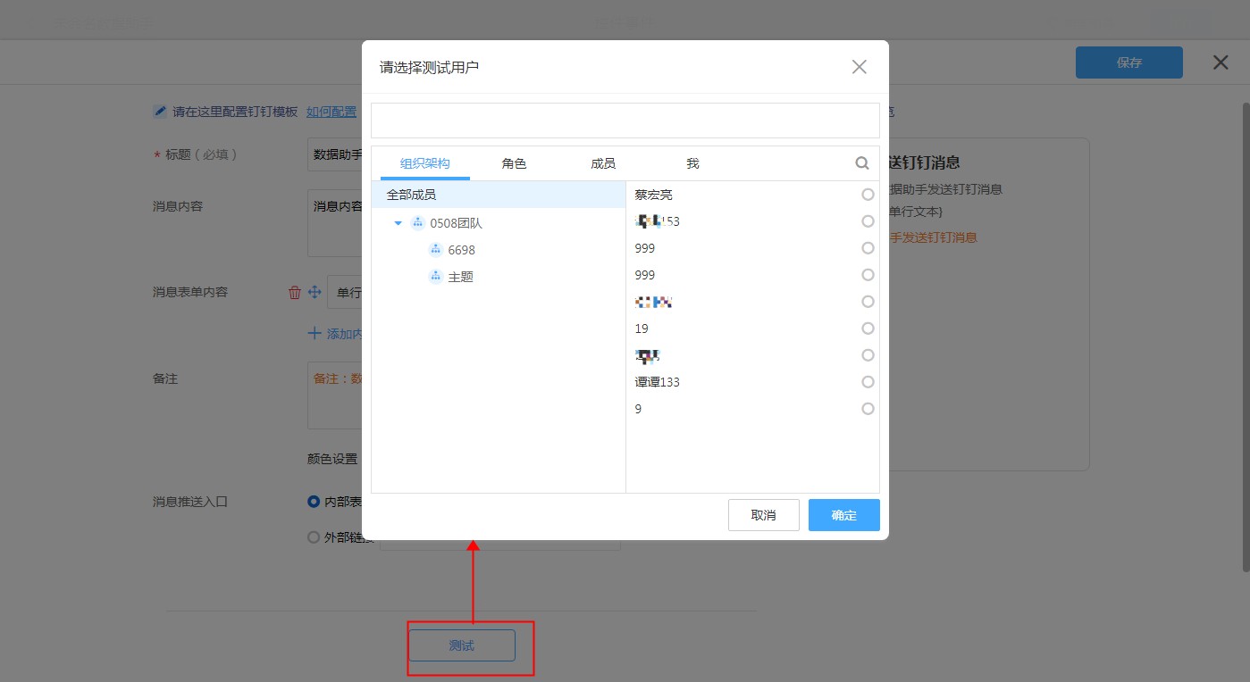 点击测试,选择收件人,确认即可将当前消息模板内容发送给此收件人。