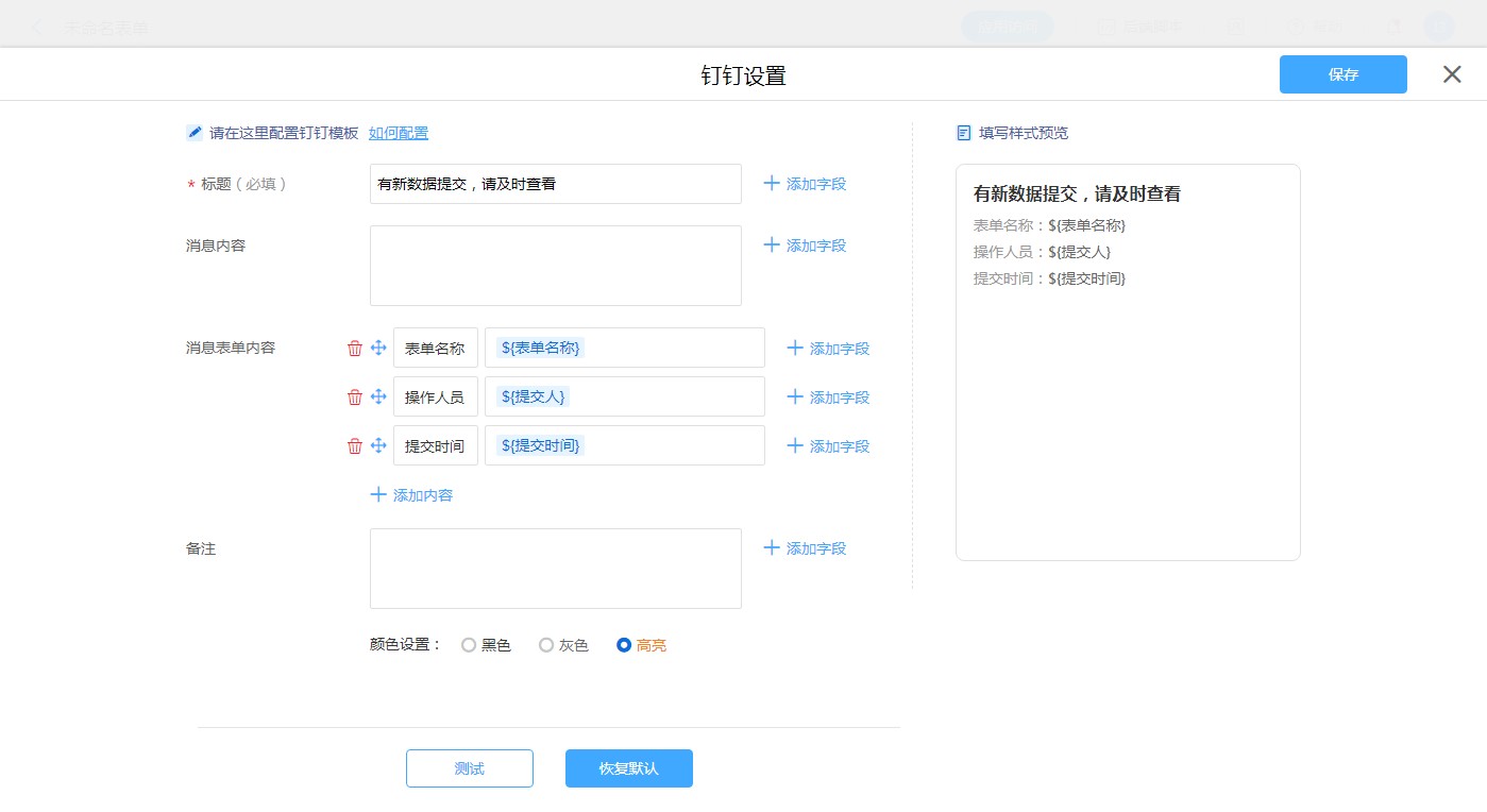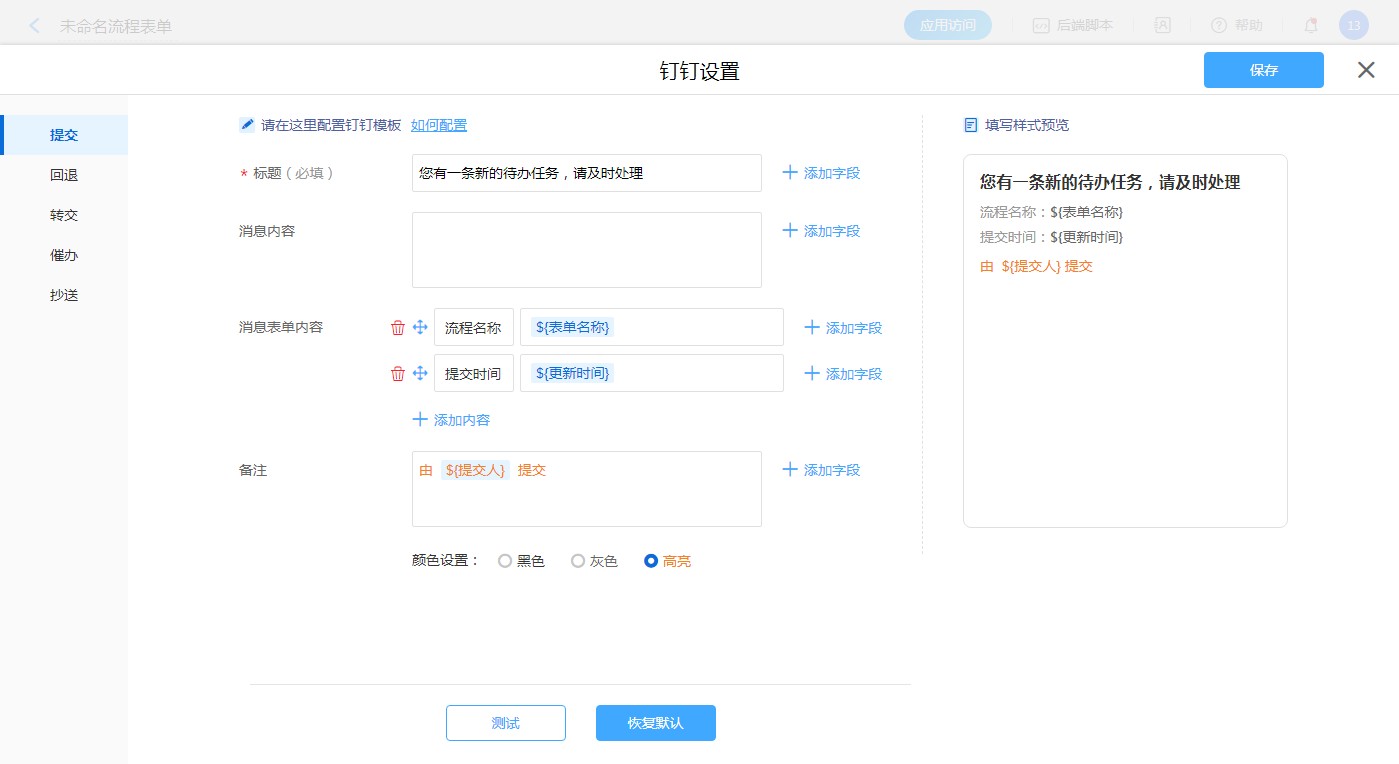 普通表单设置钉钉消息模板