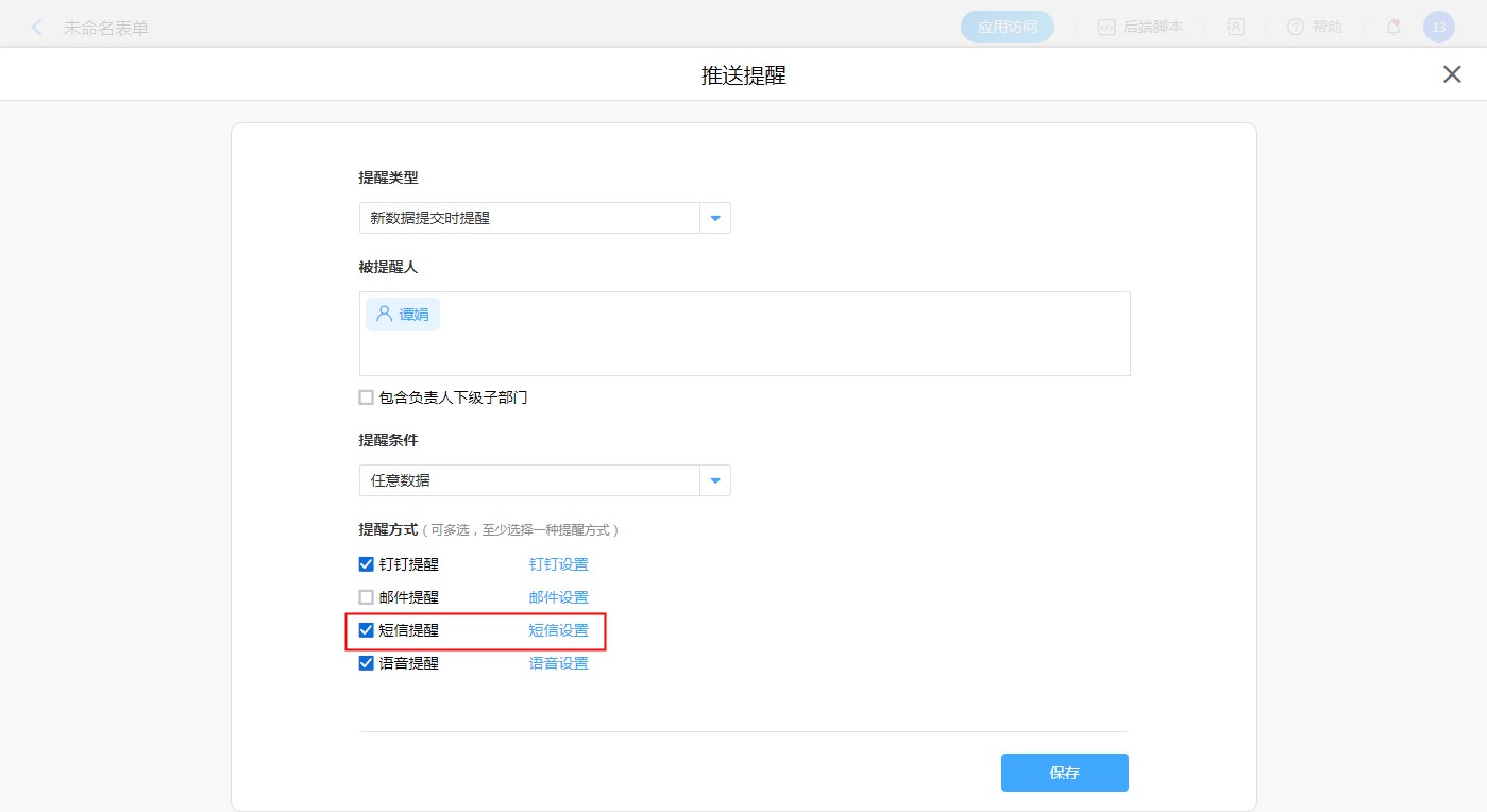【普通表单设计】-【表单设置】-【消息推送】-【新建消息推送】-【短信提醒,短信设置】