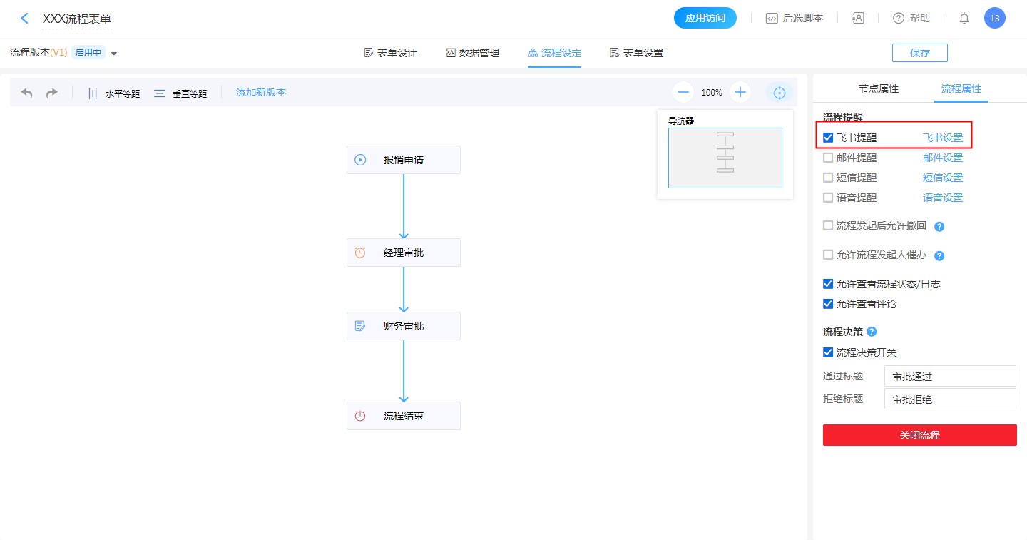 【流程设计】-【流程设定】-【流程属性】-【流程提醒】-【飞书提醒,飞书设置】