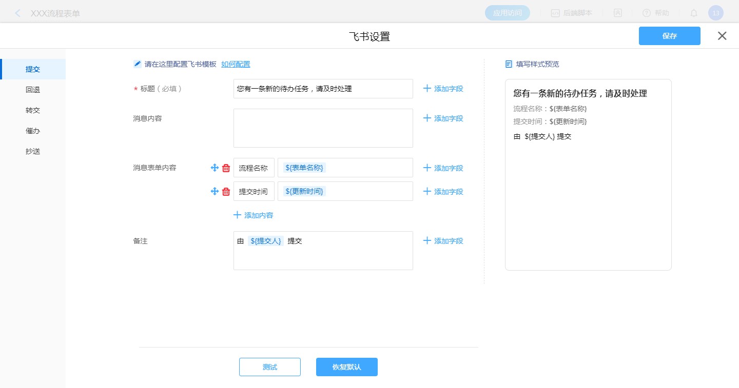 • 流程表单设置飞书消息模板
