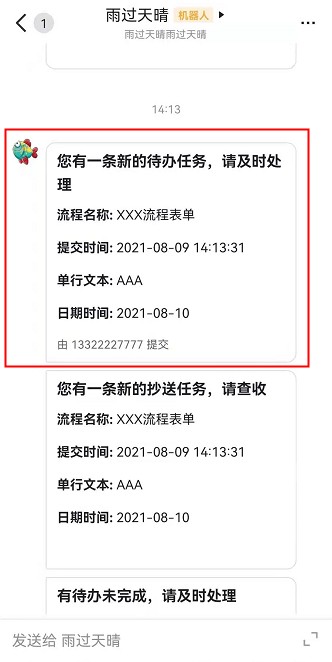 • 收到流程表单飞书消息