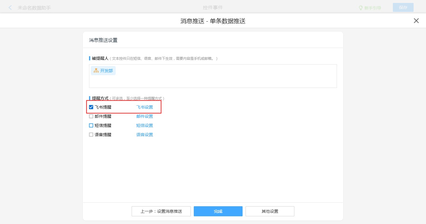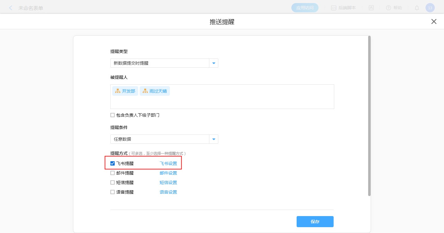 【普通表单设计】-【表单设置】-【消息推送】-【新建消息推送】-【飞书提醒,飞书设置】