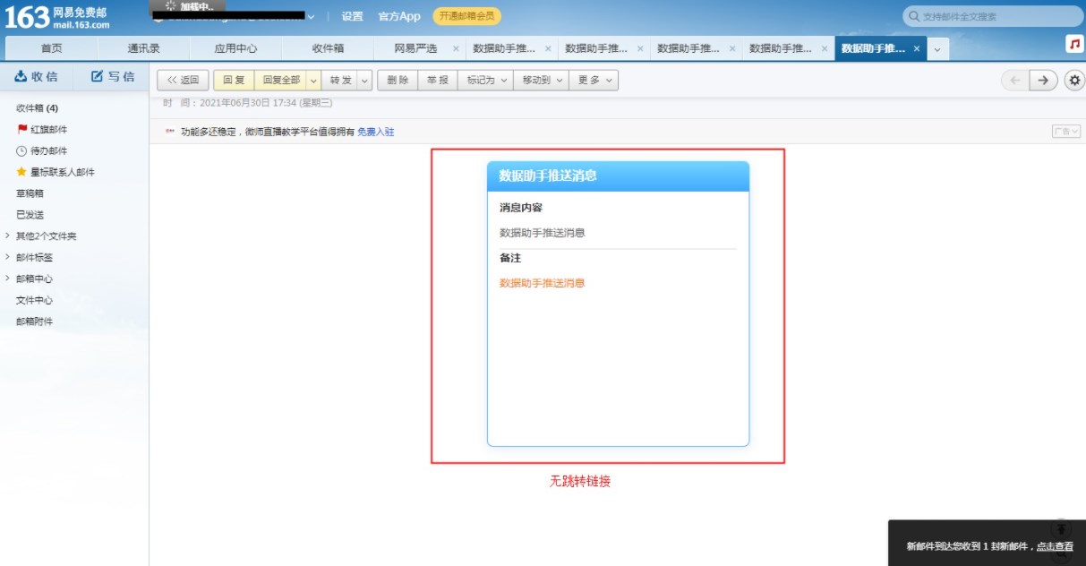 邮件消息模板类型可以设置【不设置】,收到的邮件消息中,无跳转按钮,不可跳转到任何链接。