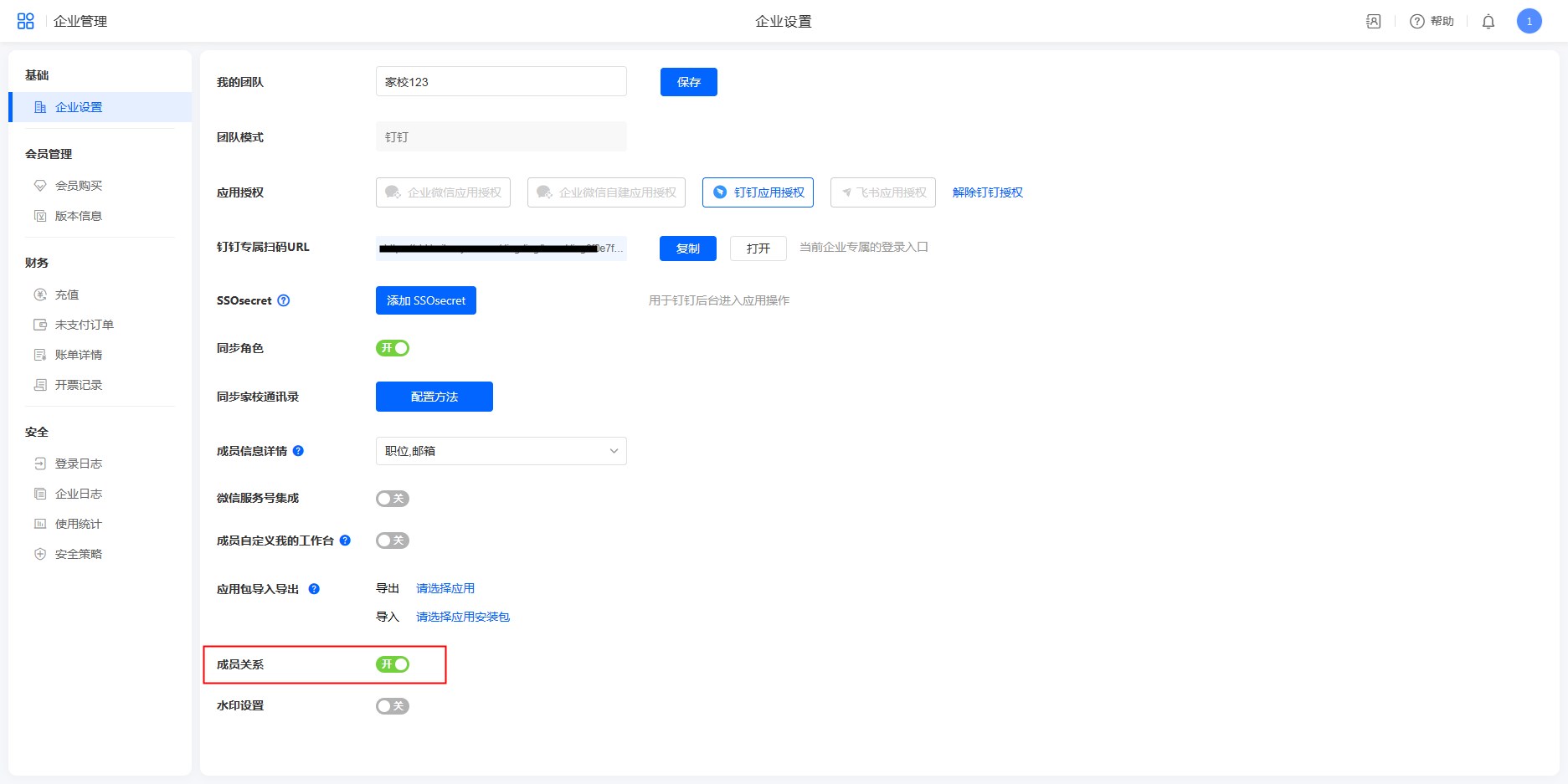 系统管理员登录,在企业管理下,开启成员关系开关后,方可使用。