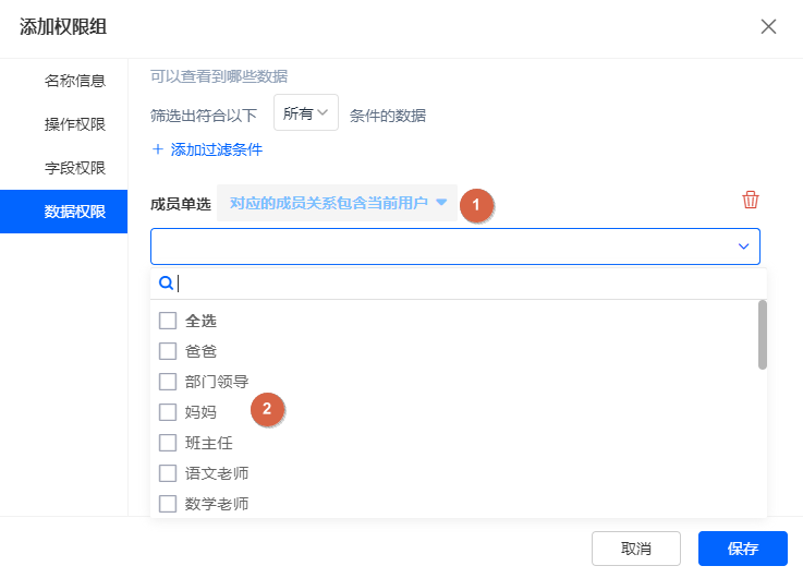 表单/报表的权限组设置成员关系 将权限分享给:指定部门(及子部门)的成员的妈妈;
