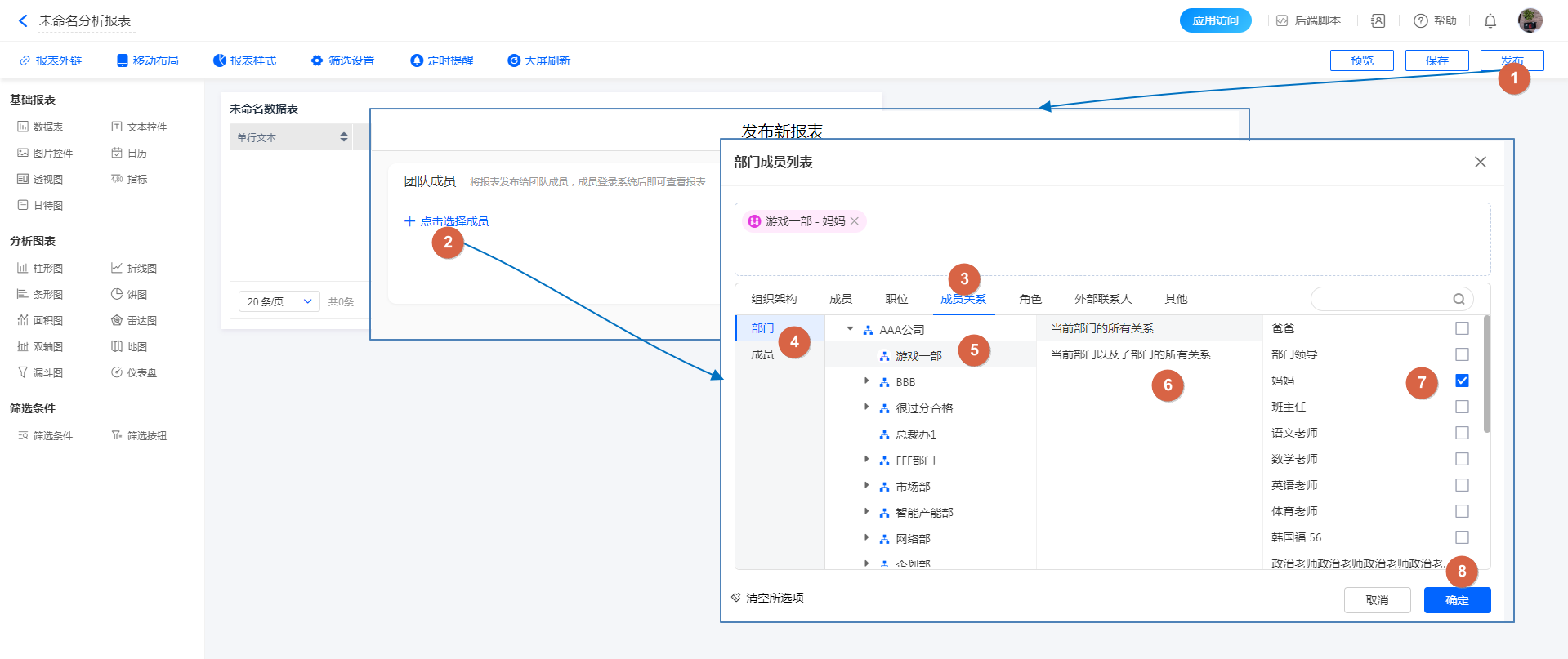 报表-发布,设置成员关系 将权限分享给:指定部门(及子部门)的成员的妈妈;