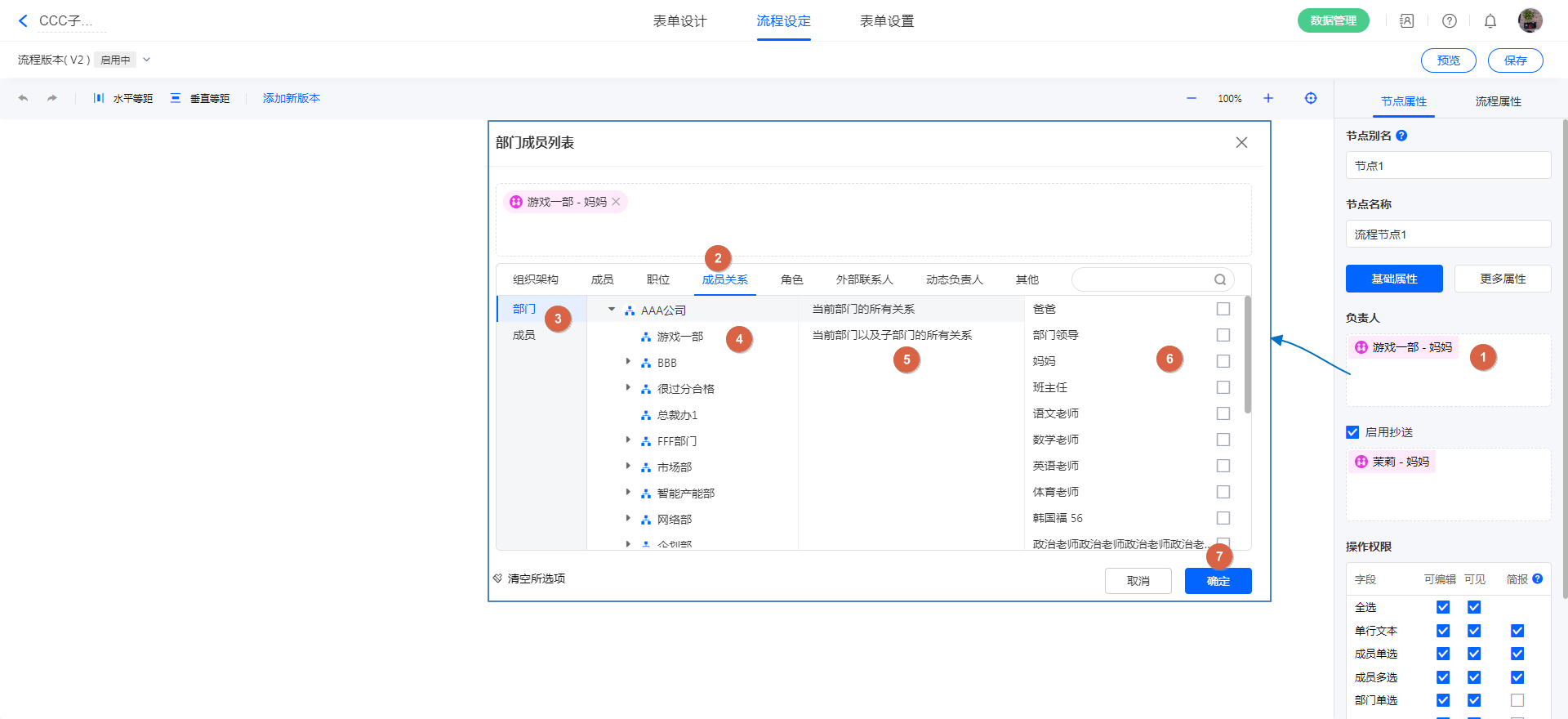 流程负责人/抄送人/转交人,设置成员关系 流程负责人为:指定部门(及子部门)的成员的妈妈;