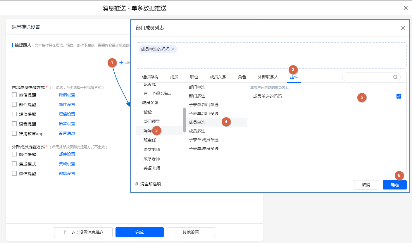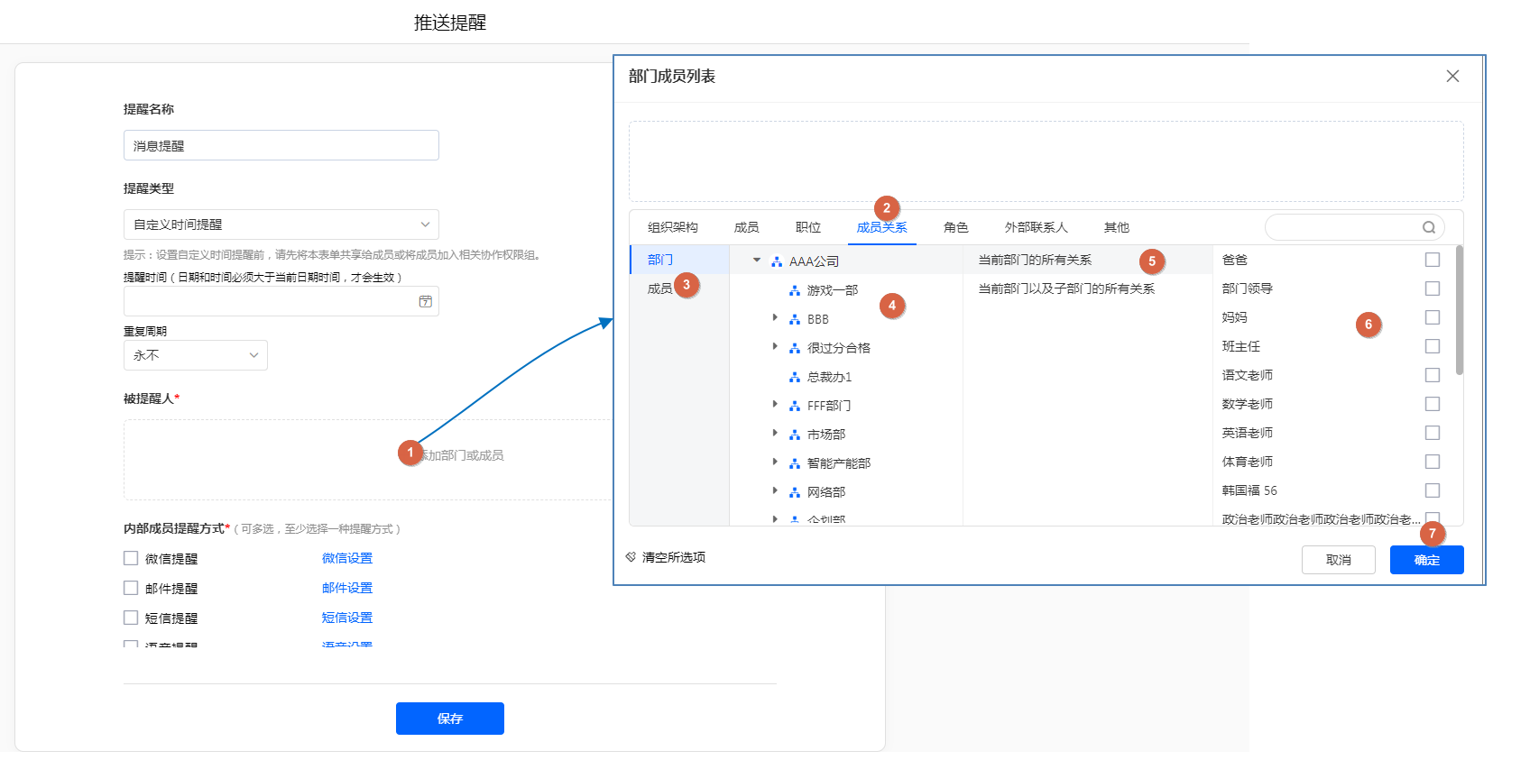 消息提醒人设置成员关系 发送消息给:指定部门(及子部门)的成员的妈妈;
